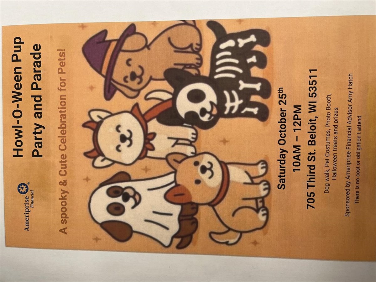 Howl-O-Ween Pup Party & Parade Date: Saturday, October 25, 2025 Time: 10:00 AM - 12:00 PM CDT Location: PARKING LOT NORTH of Irontek Building, 705 Third St, Beloit, WI 53511 Presented By: Amy Hatch, Ameriprise Financial Services, LLC Hosted By: Amy Hatch, Ameriprise Financial Services, LLC Sponsored By: Ameriprise Financial Advisor, Amy Hatch Join us for a "Spooky & Cute" Celebration for Pets! (Spectators Welcome!) Expect a fun morning featuring Pet Costume Contest, Pup Toy Grab, Photo Booth, and Pup Parade/Walk. 10:00am - 11:00am - Photo Booth & Pup Toy Grab 11:00am - 11:30am - Costume Contest & Prizes 11:30am - 12:00pm - Pup Parade/Walk (see Map for official route) *Registration is required (see disclosures) - Pre-registration is recommended You may pre-register prior to the event online, via email or in person. There will be a limited number of registrations accepted the morning of the event from 9:30am - 10:00am. Rock County Humane Society is expected to be in attendance along with a few pet vendors. To reserve a spot: call us at 608.218.1207 or email us at patricia.j.lorenz@ampf.com RSVP Online Event registration Date: Time: Enter your information below to RSVP for this event. We will contact you via phone or email to confirm your registration. First Name Last Name Email Phone (optional) Comments/Questions/Special Needs for the event (optional) Ameriprise Financial understands that privacy and security are important to you. We will only use the information to send offers we believe are relevant to you and, if you become a client, to send you information about your accounts. Visit the Email Preferences page to change your email choices. Submit Your RSVP was not sent. Return to form Thank you for your interest in this Ameriprise Financial event. We will contact you shortly to confirm your registration. Please note: Your registration is not complete until you have received final confirmation. Share Email Text message Facebook LinkedIn X Add to Calendar Google Calendar Yahoo! Calendar Share Email Text message Facebook LinkedIn X Add to Calendar Google Calendar Yahoo! Calendar All Participants must be over the age of 18, complete a waiver and must be registered prior to the event start time. One dog per participant Dogs must be accompanied by a registered participant Dogs must be leashed at all times (at a maximum 3-foot throughout the event). Participants are required to pick up after their pet Dogs must be up to date and current with all vaccinations All participants and pets must be in a stable state of health and able to endure up to a 3-mile walk Aggressive animals or those with any history of antisocial or bad behavior cannot participate Female dogs in heat, will not be allowed to participate Dogs whose behavior is unruly or might prove to be hazardous to participants, other dogs or spectators, will be asked to leave the Howl-O-Ween Pet Parade, at the sole discretion of the event coordinator.