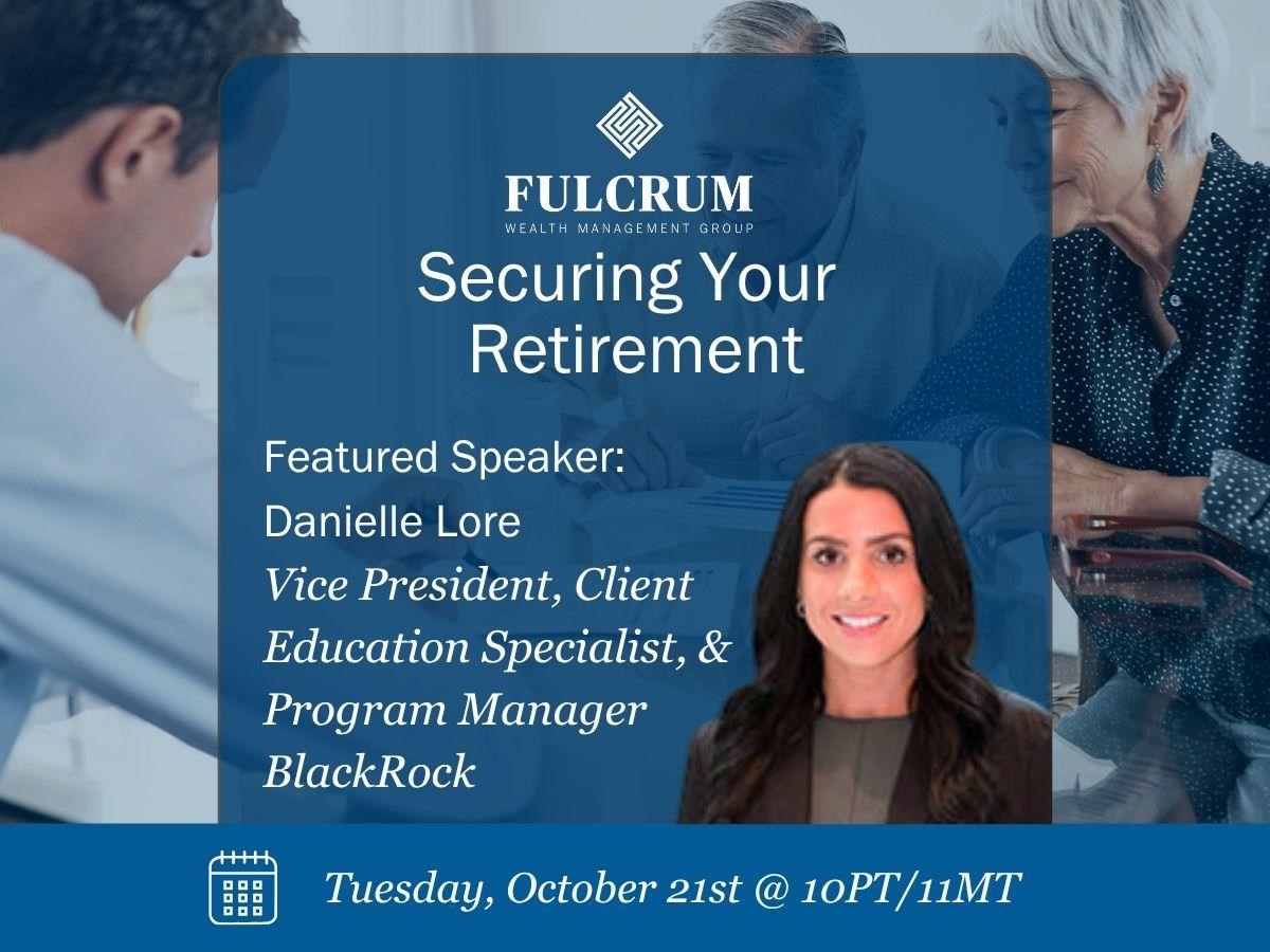 Securing Your Retirement Date: Tuesday, October 21, 2025 Time: 10:00 AM - 11:00 AM PDT ONLINE EVENT PASSCODE: NE2Ha7dU Join this event online Presented By: Danielle Lore, Vice President, Client Education Specialist, & Program Manager - BlackRock Hosted By: Fulcrum Wealth Management Group, a private wealth advisory practice of Ameriprise Financial Services, LLC Hello All, You're invited to an exclusive event on " Securing your retirement " with BlackRock. Discover how to transform Social Security into a winning retirement strategy. Danielle will cover topics such as longevity, early collection costs, retirement benefits rules, and collection strategies. Enhance your financial planning knowledge and make informed decisions for your future. Join us for this valuable session! If you have questions, please reach out. We look forward to having you join us! To reserve a spot: call us at 208.938.4416 or email us at fulcrumwealthmanagementgroup@ampf.com RSVP Online Event registration Date: Time: Enter your information below to RSVP for this event. We will contact you via phone or email to confirm your registration. First Name Last Name Email Phone (optional) Comments/Questions/Special Needs for the event (optional) Ameriprise Financial understands that privacy and security are important to you. We will only use the information to send offers we believe are relevant to you and, if you become a client, to send you information about your accounts. Visit the Email Preferences page to change your email choices. Submit Your RSVP was not sent. Return to form Thank you for your interest in this Ameriprise Financial event. We will contact you shortly to confirm your registration. Please note: Your registration is not complete until you have received final confirmation. Share Email Text message Facebook LinkedIn X Add to Calendar Google Calendar Yahoo! Calendar Share Email Text message Facebook LinkedIn X Add to Calendar Google Calendar Yahoo! Calendar Hosted by Fulcrum Wealth Management Group This is an informational seminar. There is no cost or obligation. BlackRock and its representatives are not affiliated with Ameriprise Financial Inc. Investment products are not insured by the FDIC, NCUA or any federal agency, are not deposits or obligations of, or guaranteed by any financial institution, and involve investment risks including possible loss of principal and fluctuation in value.