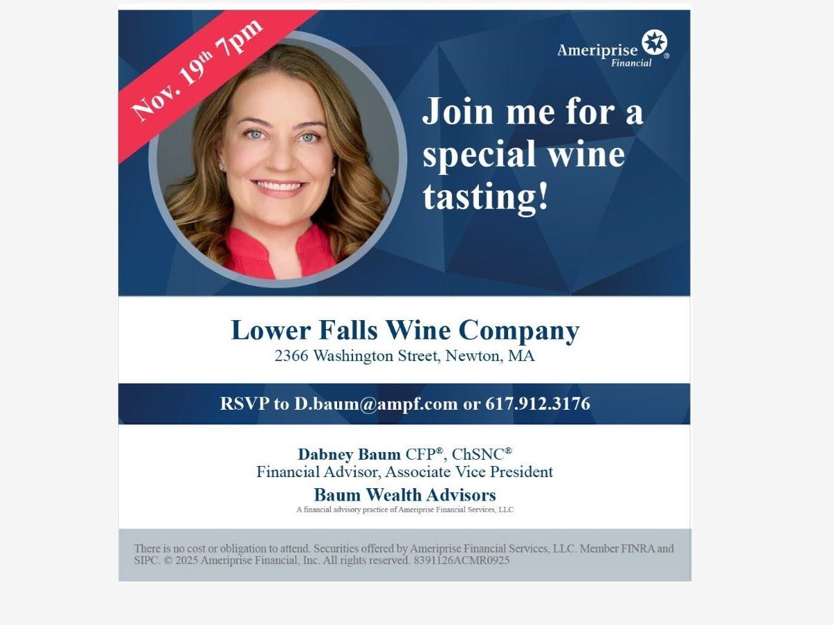 Wine Tasting Date: Wednesday, November 19, 2025 Time: 7:00 PM - 8:30 PM EST Location: Lower Falls Wine Company, 2366 Washington Street, Newton, MA 02462 Hosted By: Ameriprise Newton Branch Join me for a special wine tasting!