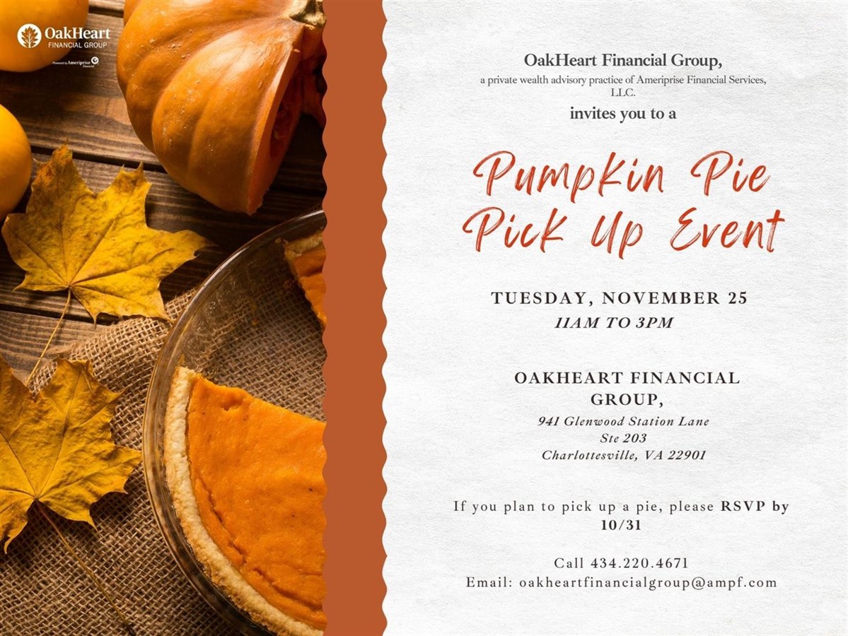Pumpkin Pie Pick Up Event Date: Tuesday, November 25, 2025 Time: 11:00 AM - 3:00 PM EST Location: OakHeart Financial Group, 941 Glenwood Station Lane, Ste 203, Charlottesville, VA 22901 Hosted By: OakHeart Financial Group, a private wealth advisory practice of Ameriprise Financial Services, LLC. To show our appreciation this time of year, we invite you to come by our office for light refreshments and a homemade pie to take home and enjoy with family and friends between 11am and 3pm on Tuesday, November 25th.Pies will be purchased locally through Chandler's Bakery, and must be ordered in advance, so please RSVP by Friday, October 31st to confirm you are picking up a pie. To reserve a spot: call us at 434.220.4671 or email us at oakheartfinancialgroup@ampf.com Share Email Text message Facebook LinkedIn X Add to Calendar Google Calendar Yahoo! Calendar There is no cost or obligation.