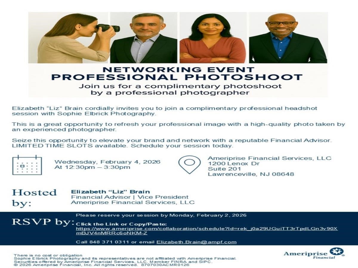 NETWORKING EVENT: PROFESSIONAL PHOTOSHOOT Date: Wednesday, February 4, 2026 Time: 12:30 PM - 3:30 PM EST Location: Ameriprise Financial Services, LLC, 1200 Lenox Dr, Suite 201, Lawrenceville, NJ 08648 Hosted By: Elizabeth “Liz” Brain Financial Advisor | Vice President Ameriprise Financial Services, LLC Please join us for a complimentary photoshoot by a professional photographer Elizabeth “Liz” Brain cordially invites you to join a complimentary professional headshot session with Sophie Elbrick Photography. This is a great opportunity to refresh your professional image with a high-quality photo taken by an experienced photographer. Seize this opportunity to elevate your brand and network with a reputable Financial Advisor. LIMITED TIME SLOTS available. Schedule your session today.