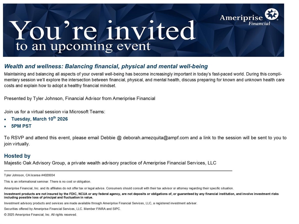 Wealth and wellness: Balancing financial, physical and mental well-being Date: Tuesday, March 10, 2026 Time: 5:00 PM - 6:00 PM PDT You must RSVP to receive access credentials for this event or seminar. Presented By: Tyler Johnson, Financial Advisor - Ameriprise Financial Hosted By: Majestic Oak Advisory Group Sponsored By: Majestic Oak Advisory Group Maintaining and balancing all aspects of your overall well-being has become increasingly important in today’s fast-paced world. During this complimentary session we’ll explore the intersection between financial, physical, and mental health, discuss preparing for known and unknown health care costs and explain how to adopt a healthy financial mindset. Tyler Johnson, CA license #4020034 This is an informational seminar. There is no cost or obligation. Ameriprise Financial, Inc. and its affiliates do not offer tax or legal advice. Consumers should consult with their tax advisor or attorney regarding their specific situation. Investment products are not insured by the FDIC, NCUA or any federal agency, are not deposits or obligations of, or guaranteed by any financial institution, and involve investment risks including possible loss of principal and fluctuation in value. Investment advisory products and services are made available through Ameriprise Financial Services, LLC, a registered investment adviser. Securities offered by Ameriprise Financial Services, LLC. Member FINRA and SIPC. © 2025 Ameriprise Financial, Inc. All rights reserved.