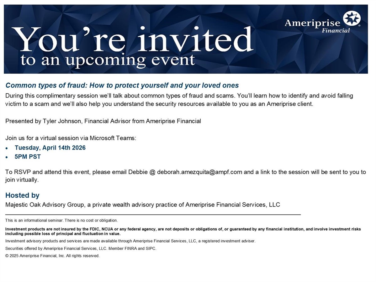 Common types of fraud: How to protect yourself and your loved ones Date: Tuesday, April 14, 2026 Time: 5:00 PM - 6:00 PM PDT You must RSVP to receive access credentials for this event or seminar. Presented By: Tyler Johnson, Financial Advisor - Ameriprise Financial Hosted By: Majestic Oak Advisory Group Sponsored By: Majestic Oak Advisory Group During this complimentary session we’ll talk about common types of fraud and scams. You’ll learn how to identify and avoid falling victim to a scam and we’ll also help you understand the security resources available to you as an Ameriprise client. This is an informational seminar. There is no cost or obligation. Investment products are not insured by the FDIC, NCUA or any federal agency, are not deposits or obligations of, or guaranteed by any financial institution, and involve investment risks including possible loss of principal and fluctuation in value. Investment advisory products and services are made available through Ameriprise Financial Services, LLC, a registered investment adviser. Securities offered by Ameriprise Financial Services, LLC. Member FINRA and SIPC. © 2025 Ameriprise Financial, Inc. All rights reserved.