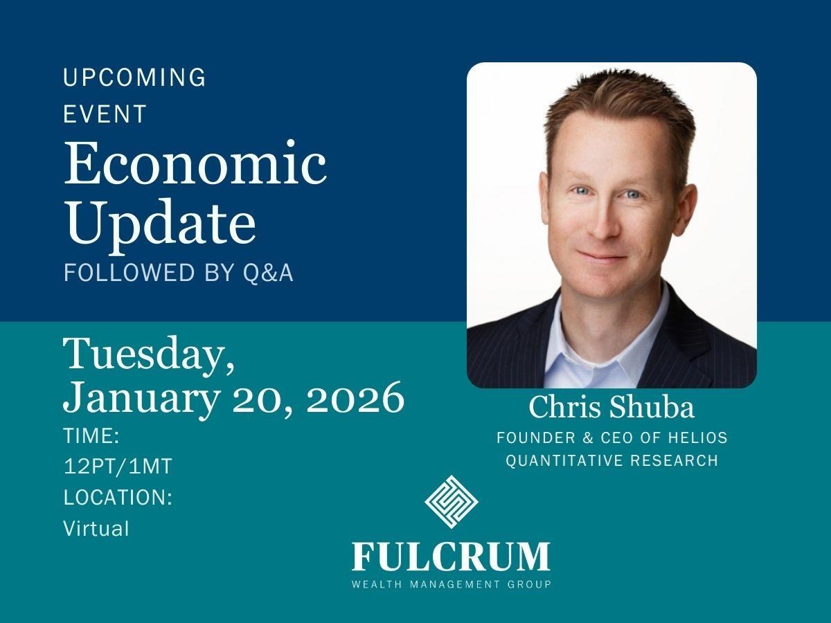 Economic Update Date: Tuesday, January 20, 2026 Time: 12:00 PM - 1:00 PM PST ONLINE EVENT PASSCODE: 3uW2RH28 Join this event online Presented By: Chris Shuba, CEO and Owner - Helios Quantitative Research Hosted By: Fulcrum Wealth Management Group, a private wealth advisory practice of Ameriprise Financial Services, LLC Hello Clients and Friends, Please join us on Tuesday, 1/20/26 as we welcome back Founder and CEO of Helios Quantitative Research, Chris Shuba, to present an Economic Update. He will provide perspective on the status of the markets, economic outlook, and conclude with Q&A. If you have a question you would like to see addressed during the event, please add it to the Comments/Questions section of your online RSVP. To reserve a spot: call us at 208.938.4416 or email us at fulcrumwealthmanagementgroup@ampf.com RSVP Online Event registration Date: Time: Enter your information below to RSVP for this event. We will contact you via phone or email to confirm your registration. First Name Last Name Email Phone (optional) Comments/Questions/Special Needs for the event (optional) Ameriprise Financial understands that privacy and security are important to you. We will only use the information to send offers we believe are relevant to you and, if you become a client, to send you information about your accounts. Visit the Email Preferences page to change your email choices. Submit Your RSVP was not sent. Return to form Thank you for your interest in this Ameriprise Financial event. We will contact you shortly to confirm your registration. Please note: Your registration is not complete until you have received final confirmation. Share Email Text message Facebook LinkedIn X Add to Calendar Google Calendar Yahoo! Calendar Share Email Text message Facebook LinkedIn X Add to Calendar Google Calendar Yahoo! Calendar By registering for this event, you agree to your personal data including, but not limited to, your name, company name, email address and registration form responses to be held and used by Ameriprise Financial Inc. for marketing purposes. More information can be found in our Privacy Policy which can be found here. By signing up to the event, Ameriprise Financial Inc. will collect your personal data to administer the event. Helios Quantitative Research and Chris Shuba are not affiliated with Ameriprise Financial Inc.