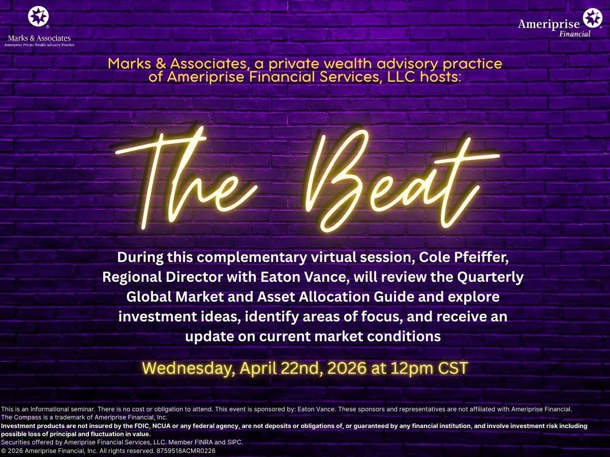 The Beat Date: Wednesday, April 22, 2026 Time: 12:00 PM - 1:00 PM CDT You must RSVP to receive access credentials for this event or seminar. Presented By: Cole Pfeiffer, Regional Director - Eaton Vance Hosted By: Marks & Associates, A private wealth advisory practice of Ameriprise Financial Services, LLC During this complimentary virtual session, Cole Pfeiffer, Regional Director with Eaton Vance, review the Quarterly Global Market and Asset Allocation Guide and explore investment ideas, identify areas of focus, and receive an update on current market conditions. To reserve a spot: email us at marks-associates@ampf.com Share Email Text message Facebook LinkedIn X Add to Calendar Google Calendar Yahoo! Calendar This is an Informational seminar. There is no cost or obligation to attend. This event is sponsored by: Eaton Vance. These sponsors and representatives are not affiliated with Ameriprise Financial.The Compass is a trademark of Ameriprise Financial, Inc.Investment products are not insured by the FDIC, NCUA or any federal agency, are not deposits or obligations of, or guaranteed by any financial institution, and involve investment risk includingpossible loss of principal and fluctuation in value. Securities offered by Ameriprise Financial Services, LLC. Member FINRA and SIPC