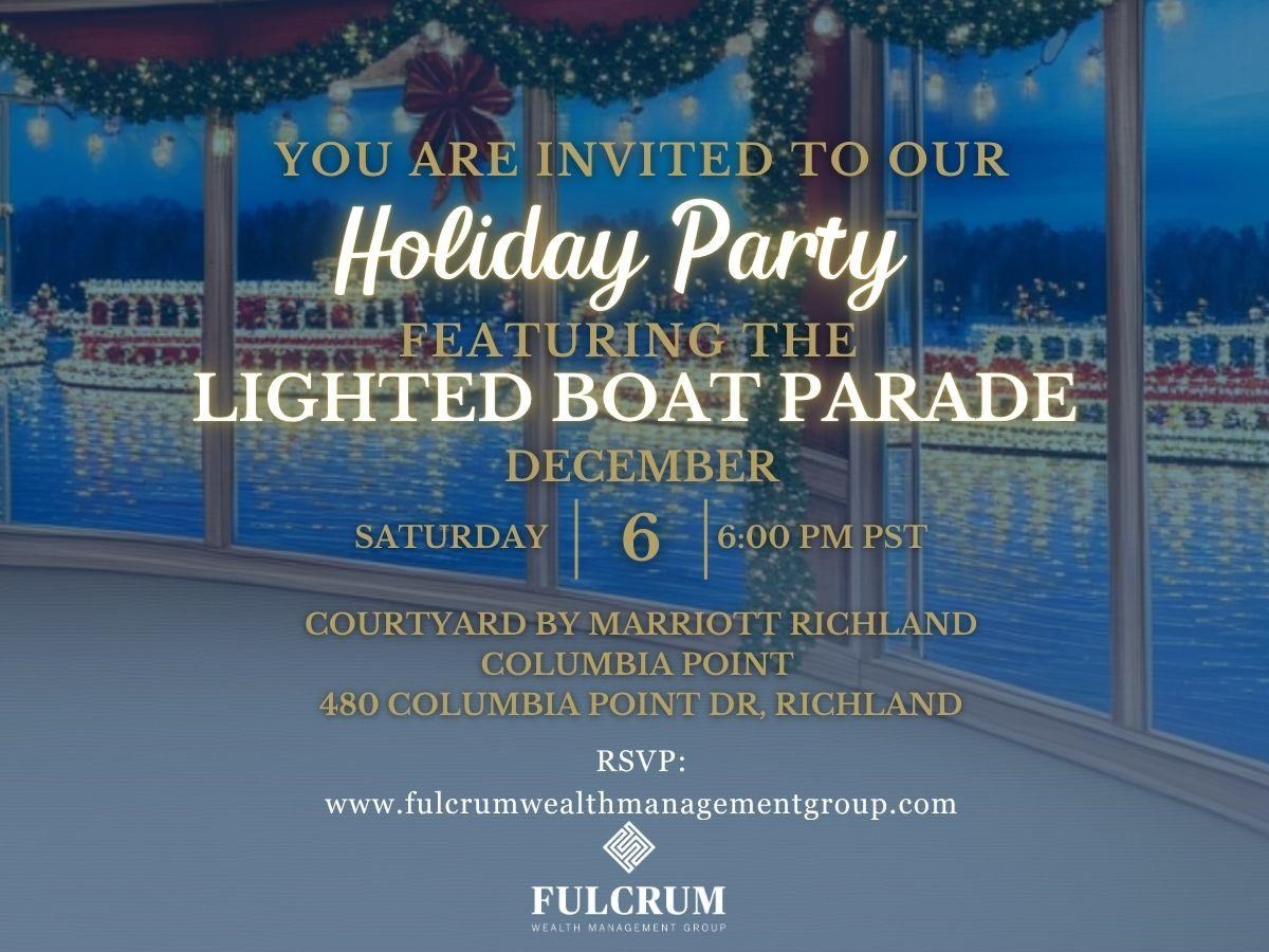 Tri-Cities Holiday Party - 6th Annual Lighted Boat Parade! Date: Saturday, December 6, 2025 Time: 6:00 PM - 8:30 PM PST Location: Courtyard by Marriott, 480 Columbia Point Drive, Richland, WA 99352 Hosted By: Fulcrum Wealth Management Group, a private wealth advisory practice of Ameriprise Financial Services, LLC Clients and friends, We are very excited to gather again to celebrate the holidays with you and to thank you for being a part of The Fulcrum Family. Please join us for food, beverages and finally, the Lighted Boat Parade! Be our Holiday Party guest on Saturday, December 6th, 2025, at Courtyard by Marriott Richland Columbia Point from 6:00PM - 8:30PM. You read that right! We’re changing venues this year. Please RSVP online by Friday, November 21st. If you are unable to attend, your regrets are appreciated. Guests are welcome! We also invite you to bring a new, unwrapped toy for our annual Toys for Tots drive to bring smiles to many children's faces this holiday season. If you have any questions regarding this event, please don’t hesitate to call at 509.987.1744. We look forward to hearing from you soon! To reserve a spot: call us at 509.987.1744 or email us at tiara.pajimola@ampf.com RSVP Online Event registration Date: Time: Enter your information below to RSVP for this event. We will contact you via phone or email to confirm your registration. First Name Last Name Email Phone (optional) Comments/Questions/Special Needs for the event (optional) Ameriprise Financial understands that privacy and security are important to you. We will only use the information to send offers we believe are relevant to you and, if you become a client, to send you information about your accounts. Visit the Email Preferences page to change your email choices. Submit Your RSVP was not sent. Return to form Thank you for your interest in this Ameriprise Financial event. We will contact you shortly to confirm your registration. Please note: Your registration is not complete until you have received final confirmation. Share Email Text message Facebook LinkedIn X Add to Calendar Google Calendar Yahoo! Calendar Share Email Text message Facebook LinkedIn X Add to Calendar Google Calendar Yahoo! Calendar There is no cost or obligation.