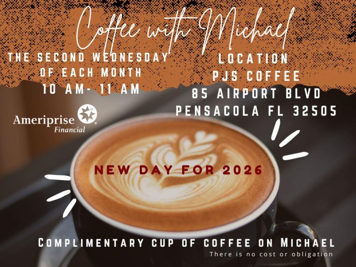 Coffee with Michael Date: Wednesday, January 14, 2026 Time: 10:00 AM - 11:00 AM CST Location: PJ's Coffee, 85 W Airport Rd, Pensacola, FL 32504 Hosted By: Michael Hoeflich, CFP® Michael and staff with be at PJ’s Coffee the second Wednesday of each month from 10 to 11. Come with your questions, have them answered, and enjoy a cup of joe at the same time! For more information: call us at 850.476.5773 or email us at lisa.d.johnson@ampf.com Share Email Text message Facebook LinkedIn X Add to Calendar Google Calendar Yahoo! Calendar