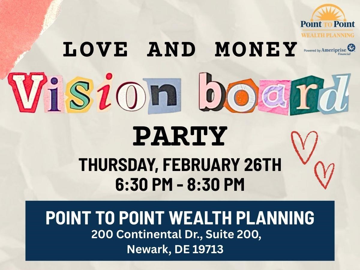 Love and Money: Couples Vision Board Party Date: Thursday, February 26, 2026 Time: 6:30 PM - 8:30 PM EST Location: Point to Point Wealth Planning, 200 Continental Dr., Ste 200, Newark, DE 19713 Hosted By: Nicole E. Brown, APMA™, CRPC™ - Financial Advisor Finances are one of the most important conversations in a relationship—and often one of the easiest to avoid. If you and your partner have ever said, “We should really get on the same page,” this evening is for you. Start the year feeling connected and confident. Join us for a fun, interactive workshop designed for couples who want to align their goals and create a vision for the life they want together. What to Expect: • All vision board supplies provided • Delicious small bites and refreshments • A relaxed Q&A with Nicole • Time to connect with other couples in a welcoming setting You’ll Leave With: · A bespoke framework for your goals and dreams · Curated next steps to make this year feel intentional and rewarding · An enhanced sense of what matters most to you as a couple · A beautiful vision board that keeps you inspired at home Bring a couple with you! Know another couple who would love to kick off the year with clarity and confidence? Invite them to join you for this motivating evening. Space is limited to 12 couples for an intimate experience—reserve your spot today! To reserve a spot: call us at 302.995.7526 or email us at nicole.magnusson@ampf.com RSVP Online Event registration Date: Time: Enter your information below to RSVP for this event. We will contact you via phone or email to confirm your registration. First Name Last Name Email Phone (optional) Comments/Questions/Special Needs for the event (optional) Ameriprise Financial understands that privacy and security are important to you. We will only use the information to send offers we believe are relevant to you and, if you become a client, to send you information about your accounts. Visit the Email Preferences page to change your email choices. Submit Your RSVP was not sent. Return to form Thank you for your interest in this Ameriprise Financial event. We will contact you shortly to confirm your registration. Please note: Your registration is not complete until you have received final confirmation. Share Email Text message Facebook LinkedIn X Add to Calendar Google Calendar Yahoo! Calendar Share Email Text message Facebook LinkedIn X Add to Calendar Google Calendar Yahoo! Calendar This is an informational seminar. There is no cost or obligation. Investment products are not insured by the FDIC, NCUA or any federal agency, are not deposits or obligations of, or guaranteed by any financial institution, and involve investment risks including possible loss of principal and fluctuation in value.