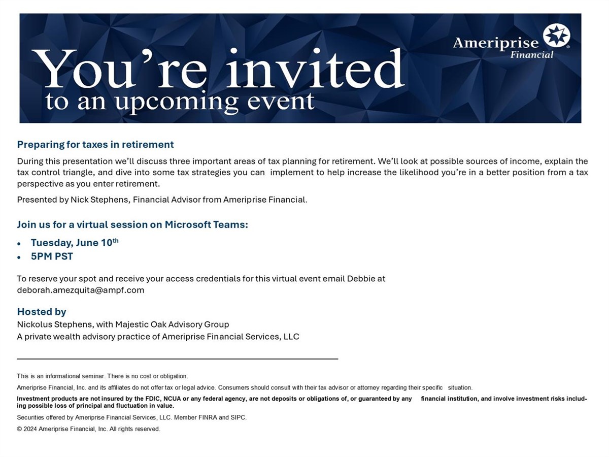Preparing for Taxes in Retirement Date: Tuesday, October 14, 2025 Time: 5:00 PM - 6:00 PM PDT You must RSVP to receive access credentials for this event or seminar. Presented By: Robert Erling, Private Wealth Advisor - Ameriprise Financial Hosted By: Majestic Oak Advisory Group During this presentation we’ll discuss three important areas of tax planning for retirement. We’ll look at possible sources of income, explain the tax control triangle, and dive into some tax strategies you can implement to help increase the likelihood you’re in a better position from a tax perspective as you enter retirement. This is an informational seminar. There is no cost or obligation. Ameriprise Financial, Inc. and its affiliates do not offer tax or legal advice. Consumers should consult with their tax advisor or attorney regarding their specific situation. Investment products are not insured by the FDIC, NCUA or any federal agency, are not deposits or obligations of, or guaranteed by any financial institution, and involve investment risks including possible loss of principal and fluctuation in value. Securities offered by Ameriprise Financial Services, LLC.Member FINRA and SIPC. © 2024 Ameriprise Financial, Inc. All rights reserved.
