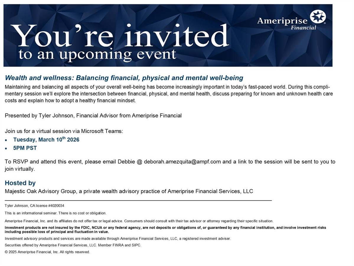 Wealth and wellness: Balancing financial, physical and mental well-being Date: Tuesday, March 10, 2026 Time: 5:00 PM - 6:00 PM PDT You must RSVP to receive access credentials for this event or seminar. Presented By: Tyler Johnson, Financial Advisor - Ameriprise Financial Hosted By: Majestic Oak Advisory Group Sponsored By: Majestic Oak Advisory Group Maintaining and balancing all aspects of your overall well-being has become increasingly important in today’s fast-paced world. During this complimentary session we’ll explore the intersection between financial, physical, and mental health, discuss preparing for known and unknown health care costs and explain how to adopt a healthy financial mindset. Tyler Johnson, CA license #4020034 This is an informational seminar. There is no cost or obligation. Ameriprise Financial, Inc. and its affiliates do not offer tax or legal advice. Consumers should consult with their tax advisor or attorney regarding their specific situation. Investment products are not insured by the FDIC, NCUA or any federal agency, are not deposits or obligations of, or guaranteed by any financial institution, and involve investment risks including possible loss of principal and fluctuation in value. Investment advisory products and services are made available through Ameriprise Financial Services, LLC, a registered investment adviser. Securities offered by Ameriprise Financial Services, LLC. Member FINRA and SIPC. © 2025 Ameriprise Financial, Inc. All rights reserved.