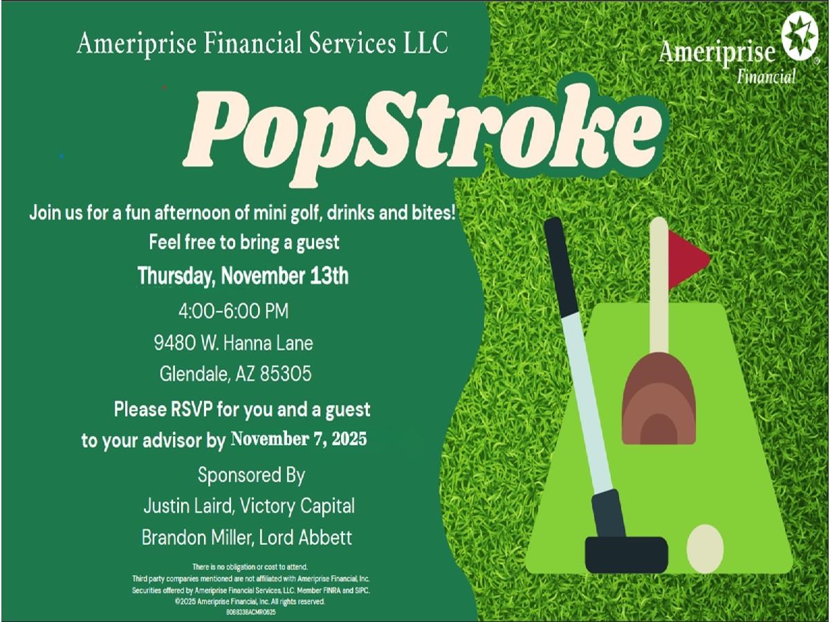 Popstroke Date: Thursday, November 13, 2025 Time: 4:00 PM - 6:00 PM MST Location: Popstroke, 9480 W. Hanna Lane, Glendale, AZ 85305 Hosted By: Ameriprise Financial LLC Sponsored By: Justin Laird, Victory Capital and Brandon Miller, Lord Abbett Join us for a fun afternoon of mini golf, drinks and bites! To reserve a spot: call us at 623.974.6800 or email us at sharyn.krutoy@ampf.com Share Email Text message Facebook LinkedIn X Add to Calendar Google Calendar Yahoo! Calendar There is no obligation or cost to attend. Victory Capital and Lord Abbett are not affiliated with Ameriprise Financial, Inc. Securities offered by Ameriprise Financial Services, LLC. Member FINRA and SIPC.