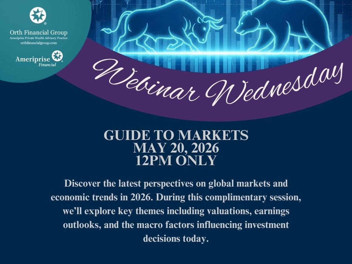 Guide to the Market 2Q 2026 Date: Wednesday, May 20, 2026 Time: 12:00 PM - 1:00 PM EDT Join this event online Presented By: Chris Scales, Vice President - JP Morgan Asset Management Hosted By: Orth Financial Group, a private wealth advisory practice of Ameriprise Financial Services, LLC Discover the latest perspectives on global markets and economic trends in 2026. During this complimentary session, we’ll explore key themes including valuations, earnings outlooks, and the macro factors influencing investment decisions today. For more information: call us at 302.475.5105 or email us at Orthfinancialgroup@ampf.com Share Email Text message Facebook LinkedIn X Add to Calendar Google Calendar Yahoo! Calendar This is an informational seminar. There is no cost or obligation. JPMorgan is not affiliated with Ameriprise Financial. Investment products are not insured by the FDIC, NCUA or any federal agency, are not deposits or obligations of, or guaranteed by any financial institution, and involve investment risks including possible loss of principal and fluctuation in value. Securities offered by Ameriprise Financial Services, LLC. Member FINRA and SIPC. © 2026 Ameriprise Financial, Inc. All rights reserved.