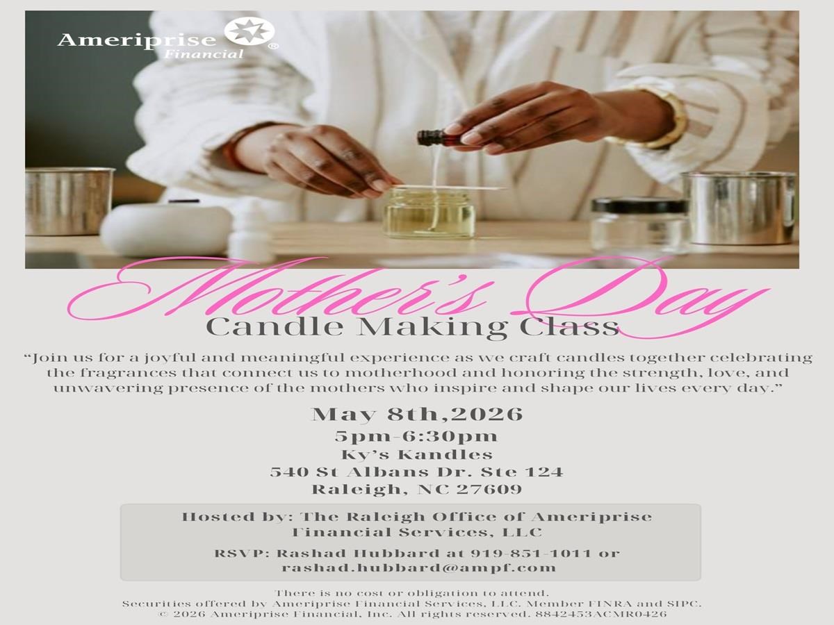 Mother's Day Candle Making Class Date: Friday, May 8, 2026 Time: 5:00 PM - 6:30 PM EDT Location: KY's Kandles, 540 St Albans Dr, Ste 124, Raleigh, NC 27609 Hosted By: The Raleigh Office of Ameriprise Financial Services, LLC Join us for a joyful and meaningful experience as we craft candles together celebrating the fragrances that connect us to motherhood and honoring the strength, love, and unwavering presence of the mothers who inspire and shape our lives every day. To reserve a spot: call us at 919.851.1011 or email us at rashad.hubbard@ampf.com RSVP Online Event registration Date: Time: Enter your information below to RSVP for this event. We will contact you via phone or email to confirm your registration. First Name Last Name Email Phone (optional) Comments/Questions/Special Needs for the event (optional) Ameriprise Financial understands that privacy and security are important to you. We will only use the information to send offers we believe are relevant to you and, if you become a client, to send you information about your accounts. Visit the Email Preferences page to change your email choices. Submit Your RSVP was not sent. Return to form Thank you for your interest in this Ameriprise Financial event. We will contact you shortly to confirm your registration. Please note: Your registration is not complete until you have received final confirmation. Share Email Text message Facebook LinkedIn X Add to Calendar Google Calendar Yahoo! Calendar Share Email Text message Facebook LinkedIn X Add to Calendar Google Calendar Yahoo! Calendar Thereis no cost or obligation to attend. Securitiesoffered by Ameriprise Financial Services, LLC. Member FINRA and SIPC. © 2026 Ameriprise Financial, Inc.All rights reserved.