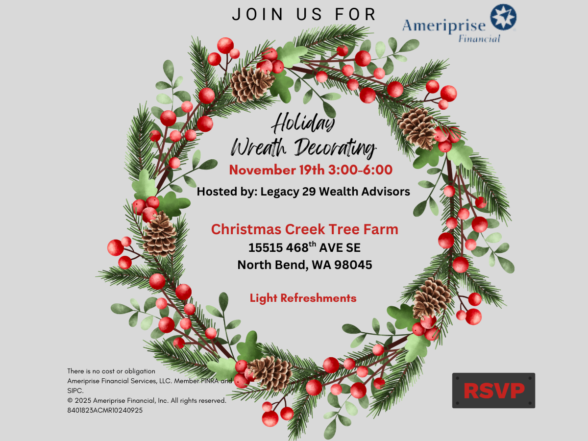 Holiday Wreath Decorating Date: Wednesday, November 19, 2025 Time: 3:00 PM - 6:00 PM PST Location: Christmas Creek Tree Farm, 15515 468th Ave SE, North Bend, WA 98045 Hosted By: Legacy 29 Wealth Advisors, a private wealth advisory practice of Ameriprise Financial Services, LLC Sponsored By: Ameriprise Financial Services, LLC We will have wreaths and decorations for attendees to create Holiday Wreaths. To reserve a spot: call us at 425.372.4815 or email us at jennifer.mcdowell@ampf.com RSVP Online Event registration Date: Time: Enter your information below to RSVP for this event. We will contact you via phone or email to confirm your registration. First Name Last Name Email Phone (optional) Comments/Questions/Special Needs for the event (optional) Ameriprise Financial understands that privacy and security are important to you. We will only use the information to send offers we believe are relevant to you and, if you become a client, to send you information about your accounts. Visit the Email Preferences page to change your email choices. Submit Your RSVP was not sent. Return to form Thank you for your interest in this Ameriprise Financial event. We will contact you shortly to confirm your registration. Please note: Your registration is not complete until you have received final confirmation. Share Email Text message Facebook LinkedIn X Add to Calendar Google Calendar Yahoo! Calendar Share Email Text message Facebook LinkedIn X Add to Calendar Google Calendar Yahoo! Calendar There is no cost or obligation.Ameriprise Financial Services, LLC. Member FINRA and SIPC.@2025 Ameriprise Financial, Inc. All rights reserved 8401823ACMR0925