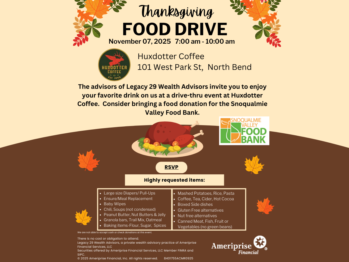 Food Drive Date: Friday, November 7, 2025 Time: 7:00 AM - 10:00 AM PST Location: Huxdotter Coffee, 101 West Park ST, North Bend, WA 98045 Hosted By: Legacy 29 Wealth Advisors The advisors of Legacy 29 Wealth Advisors invite you to enjoy your favorite drink on us at a drive-thru event at Huxdotter Coffee. Consider bringing a food donation for the Snoqualmie Valley Food Bank. To reserve a spot: call us at 425.372.4815 or email us at jennifer.mcdowell@ampf.com RSVP Online Event registration Date: Time: Enter your information below to RSVP for this event. We will contact you via phone or email to confirm your registration. First Name Last Name Email Phone (optional) Comments/Questions/Special Needs for the event (optional) Ameriprise Financial understands that privacy and security are important to you. We will only use the information to send offers we believe are relevant to you and, if you become a client, to send you information about your accounts. Visit the Email Preferences page to change your email choices. Submit Your RSVP was not sent. Return to form Thank you for your interest in this Ameriprise Financial event. We will contact you shortly to confirm your registration. Please note: Your registration is not complete until you have received final confirmation. Share Email Text message Facebook LinkedIn X Add to Calendar Google Calendar Yahoo! Calendar Share Email Text message Facebook LinkedIn X Add to Calendar Google Calendar Yahoo! Calendar