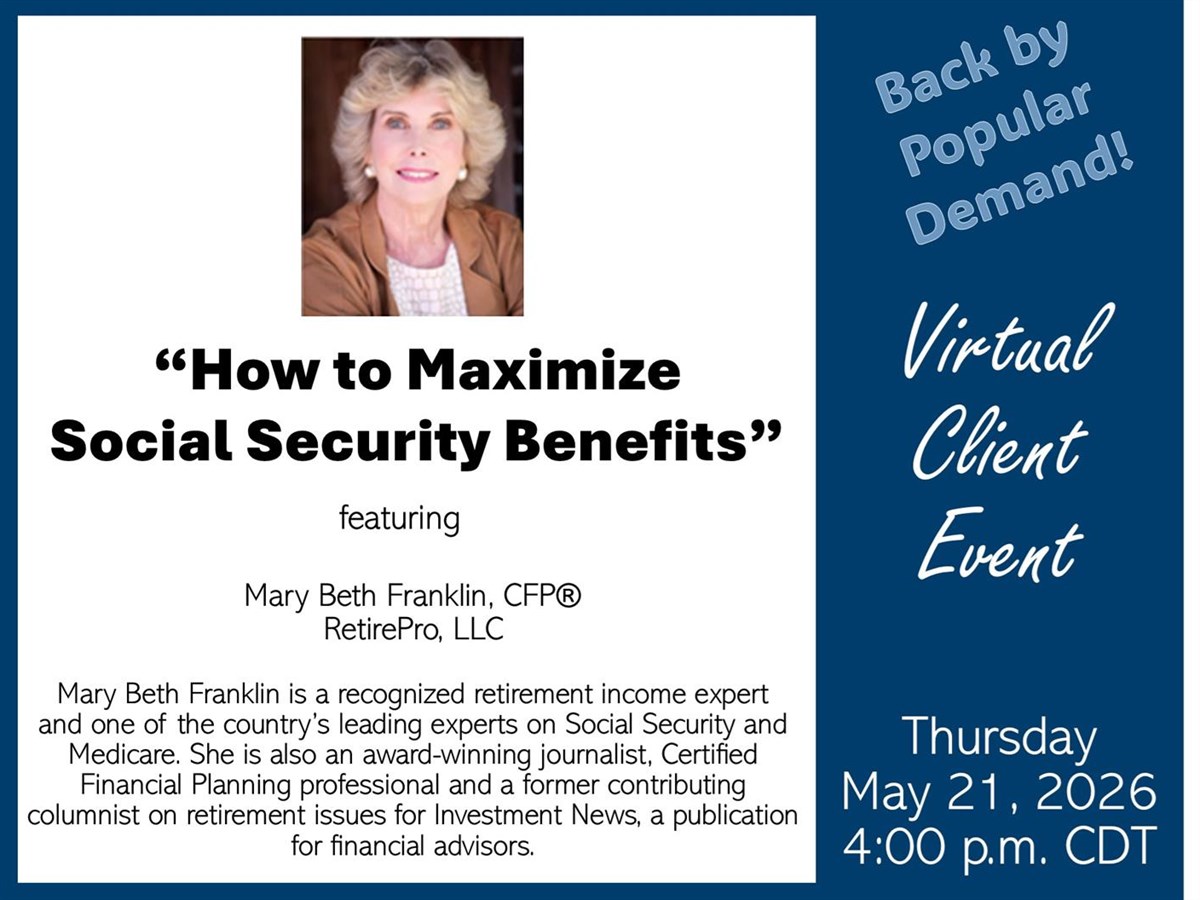 Virtual Event - "How to Maximize Social Security Benefits" Date: Thursday, May 21, 2026 Time: 4:00 PM - 5:00 PM CDT Join this event online Presented By: Mary Beth Franklin, CFP® from RetirePro, LLC - Not Affiliated Hosted By: Achieve Private Wealth, Ameriprise Financial Services, LLC Join us for a virtual presentation on Thursday – May 21st, 2026. The event is complimentary. Below are details about the event. Thursday, May 21st, 2026: 4pm – 5pm Central "How to Maximize Social Security Benefits," a one-hour webinar with guest speaker, Mary Beth Franklin, CFP® RetirePro, LLC., is a recognized retirement income expert and one of the country’s leading experts on Social Security & Medicare. She is an award-winning journalist, Certified Financial Planning professional and a former contributing columnist on retirement issues for Investment News, a publication for financial advisors. During this event, she will explain Social Security eligibility rules and claiming strategies and the impact of the latest 2.8% cost-of-living adjustment on benefit amounts in 2026. She will also outline how the recent repeal of two controversial Social Security rules will increase benefits for millions of retired public-sector workers, including many police, firefighters, teachers and state and local workers. Finally, Franklin will detail how the new temporary tax deduction for taxpayers aged 65 and older could impact the taxation of Social Security benefits. For more information: call us at 417.877.0252 or email us at taryn.may@ampf.com RSVP Online Event registration Date: Time: Enter your information below to RSVP for this event. We will contact you via phone or email to confirm your registration. First Name Last Name Email Phone (optional) Comments/Questions/Special Needs for the event (optional) Ameriprise Financial understands that privacy and security are important to you. We will only use the information to send offers we believe are relevant to you and, if you become a client, to send you information about your accounts. Visit the Email Preferences page to change your email choices. Submit Your RSVP was not sent. Return to form Thank you for your interest in this Ameriprise Financial event. We will contact you shortly to confirm your registration. Please note: Your registration is not complete until you have received final confirmation. Share Email Text message Facebook LinkedIn X Add to Calendar Google Calendar Yahoo! Calendar Share Email Text message Facebook LinkedIn X Add to Calendar Google Calendar Yahoo! Calendar By registering for this event, you agree to your personal data including, but not limited to, your name, company name, email address and registration form responses to be held and used by Ameriprise Financial Inc. for marketing purposes. More information can be found in our Privacy Policy which can be found here. By signing up to the event, Ameriprise Financial Inc. will collect your personal data to administer the event. This is an informational seminar. There is no cost or obligation. Mary Beth Franklin and RetirePro, LLC are not affiliated with Ameriprise Financial. Always consult a Medicare agent regarding your specific Medicare questions and decisions and a Social Security agent regarding your specific Social Security decisions. Ameriprise Financial, Inc. does not offer tax or legal advice. Consult with a tax advisor or attorney. Investment products are not insured by the FDIC, NCUA or any federal agency, are not deposits or obligations of, or guaranteed by any financial institution, and involve investment risks including possible loss of principal and fluctuation in value. 8792087ACMR0226