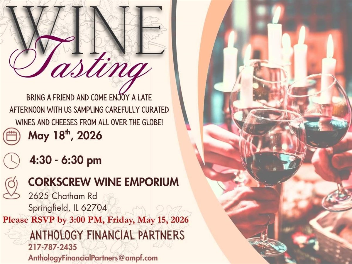 Wine Tasting Date: Monday, May 18, 2026 Time: 4:30 PM - 6:30 PM CDT Location: Corkscrew Wine Emporium, 2625 Chatham Road, Springfield, IL 62704 Hosted By: Anthology Financial Partners, a private wealth advisory practice of Ameriprise Financial Services, LLC Bring a friend and come enjoy a late afternoon with us sampling carefully curated cheeses and wines from around the globe! To reserve a spot: call us at 217.787.2435 or email us at anthologyfinancialpartners@ampf.com RSVP Online Event registration Date: Time: Enter your information below to RSVP for this event. We will contact you via phone or email to confirm your registration. First Name Last Name Email Phone (optional) Comments/Questions/Special Needs for the event (optional) Ameriprise Financial understands that privacy and security are important to you. We will only use the information to send offers we believe are relevant to you and, if you become a client, to send you information about your accounts. Visit the Email Preferences page to change your email choices. Submit Your RSVP was not sent. Return to form Thank you for your interest in this Ameriprise Financial event. We will contact you shortly to confirm your registration. Please note: Your registration is not complete until you have received final confirmation. Share Email Text message Facebook LinkedIn X Add to Calendar Google Calendar Yahoo! Calendar Share Email Text message Facebook LinkedIn X Add to Calendar Google Calendar Yahoo! Calendar
