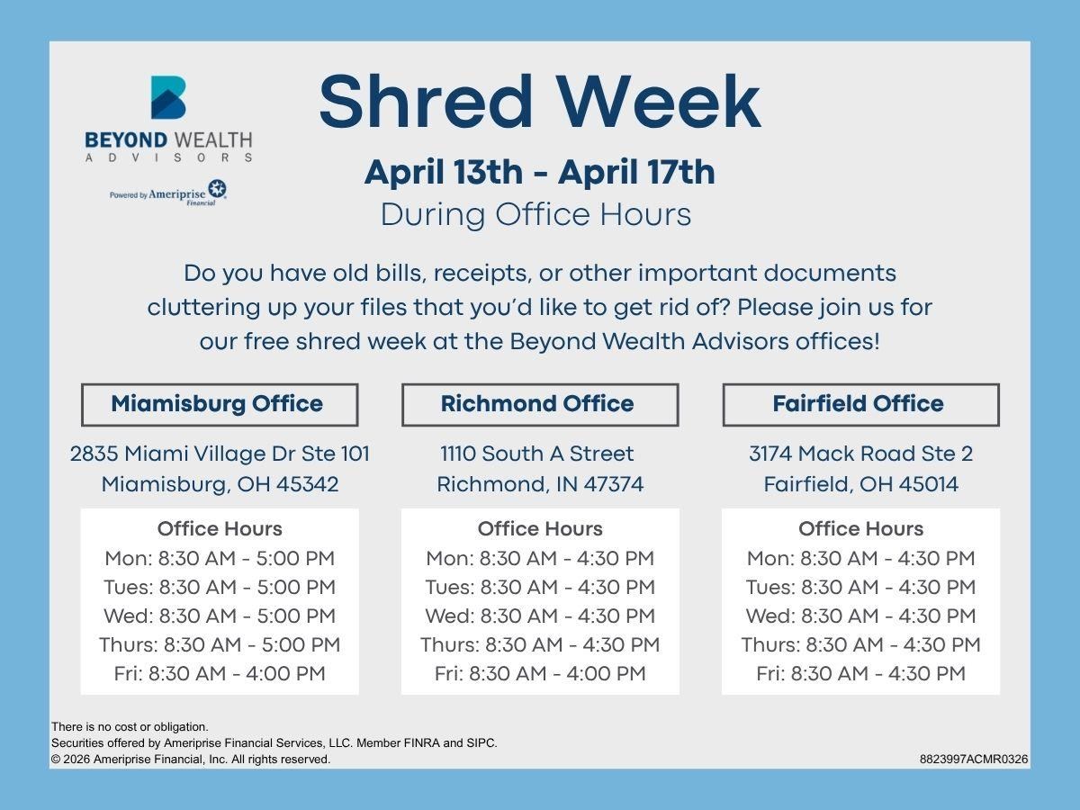 Shred Week Date: Monday, April 13, 2026 Time: 8:30 AM - 4:00 PM EDT Location: Beyond Wealth Advisors, 2835 Miami Village Dr Ste 101, Miamisburg, OH 45342 Hosted By: Beyond Wealth Advisors, a private wealth advisory practice of Ameriprise Financial Services, LLC. April 13th - April 17th During Office Hours Do you have old bills, receipts, or other important documents cluttering up your files that you’d like to get rid of? Please join us for our free shred week at the Beyond Wealth Advisors offices! Miamisburg Office: 2835 Miami Village Dr Ste 101, Miamisburg, OH 45342 Richmond Office: 1110 South A Street, Richmond, IN 47374 Fairfield Office: 3174 Mack Road Ste 2, Fairfield, OH 45014 For more information: call us at 937.312.8172 or email us at beyondwealthadvisors@ampf.com Share Email Text message Facebook LinkedIn X Add to Calendar Google Calendar Yahoo! Calendar There is no cost or obligation. Securities offered by Ameriprise Financial Services, LLC. Member FINRA and SIPC. © 2026 Ameriprise Financial, Inc. All rights reserved. 8823997ACMR0326