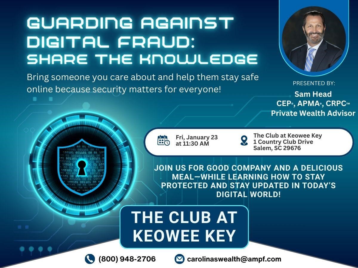 Guarding Against Digital Fraud: Share the Knowledge Date: Friday, January 23, 2026 Time: 11:30 AM - 1:00 PM EST Location: The Club at Keowee Key, 1 Country Club Drive, Salem, SC 29676 Presented By: Sam Head CEP®, APMA®, CRPC™, Private Wealth Advisor Hosted By: Carolinas Wealth Management, a private wealth advisory practice of Ameriprise Financial Services, LLC Leveraging Technology While Protecting Yourself in the Digital World Learn More About: • How Ameriprise helps protect your information • Online security guarantee • Working together online and on the go • Protecting yourself online • Recognizing common types of fraud and scams Join us for good company and a delicious meal -while learning how to stay protected and stay updated in today’s digital world! THIS EVENT IS AT THE CLUB AT KEOWEE KEY To reserve a spot: call us at 800.948.2706 or email us at carolinaswealth@ampf.com RSVP Online Event registration Date: Time: Enter your information below to RSVP for this event. We will contact you via phone or email to confirm your registration. First Name Last Name Email Phone (optional) Comments/Questions/Special Needs for the event (optional) Ameriprise Financial understands that privacy and security are important to you. We will only use the information to send offers we believe are relevant to you and, if you become a client, to send you information about your accounts. Visit the Email Preferences page to change your email choices. Submit Your RSVP was not sent. Return to form Thank you for your interest in this Ameriprise Financial event. We will contact you shortly to confirm your registration. Please note: Your registration is not complete until you have received final confirmation. Share Email Text message Facebook LinkedIn X Add to Calendar Google Calendar Yahoo! Calendar Share Email Text message Facebook LinkedIn X Add to Calendar Google Calendar Yahoo! Calendar This is an informational seminar. There is no cost or obligation. Not FDIC or NCUA Insured | No Financial Institution Guarantee | May Lose Value Securities offered by Ameriprise Financial Services, LLC. Member FINRA and SIPC. © 2025 Ameriprise Financial, Inc. All rights reserved. Legal File 8667207 ACMR1225
