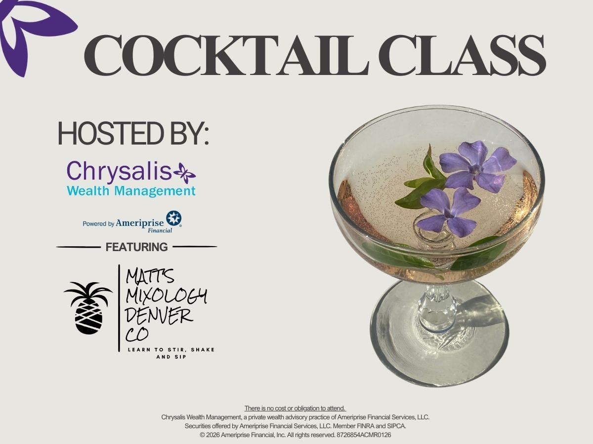 Cocktail Class Date: Saturday, February 21, 2026 Time: 2:00 PM - 5:00 PM MST Location: Shift Littleton, 2679 W Main, Littleton, CO 80120 Hosted By: Kimberly Maez Join us for a networking experience that blends connection and creativity. Guests will enjoy a guided cocktail class with an instructor from Matt's Mixology Denver, who will show how to craft two cocktails as you mix, sip, eat, and learn. To reserve a spot: email us at chrysaliswealthmanagement@ampf.com RSVP Online Event registration Date: Time: Enter your information below to RSVP for this event. We will contact you via phone or email to confirm your registration. First Name Last Name Email Phone (optional) Comments/Questions/Special Needs for the event (optional) Ameriprise Financial understands that privacy and security are important to you. We will only use the information to send offers we believe are relevant to you and, if you become a client, to send you information about your accounts. Visit the Email Preferences page to change your email choices. Submit Your RSVP was not sent. Return to form Thank you for your interest in this Ameriprise Financial event. We will contact you shortly to confirm your registration. Please note: Your registration is not complete until you have received final confirmation. Share Email Text message Facebook LinkedIn X Add to Calendar Google Calendar Yahoo! Calendar Share Email Text message Facebook LinkedIn X Add to Calendar Google Calendar Yahoo! Calendar