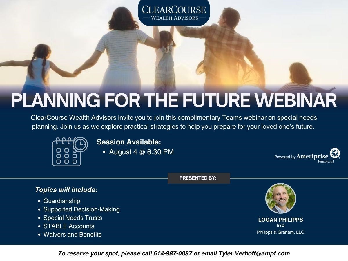 Planning for the Future Webinar Date: Tuesday, August 4, 2026 Time: 6:30 PM - 7:30 PM EDT ONLINE EVENT PASSCODE: aM2Hx3VH Join this event online Presented By: Logan Philipps, ESQ - Philipps & Graham, LLC Hosted By: ClearCourse Wealth Advisors Complimentary Microsoft Teams webinar focused on special needs planning. join us as we explore practical strategies to help you prepare for your loved one's future.Topics include:GuardianshipSupported Decision-MakingSpecial Needs TrustSTABLE Account Waivers and Benefits To reserve a spot: call us at 614.987.0087 or email us at tyler.verhoff@ampf.com RSVP Online Event registration Date: Time: Enter your information below to RSVP for this event. We will contact you via phone or email to confirm your registration. First Name Last Name Email Phone (optional) Comments/Questions/Special Needs for the event (optional) Ameriprise Financial understands that privacy and security are important to you. We will only use the information to send offers we believe are relevant to you and, if you become a client, to send you information about your accounts. Visit the Email Preferences page to change your email choices. Submit Your RSVP was not sent. Return to form Thank you for your interest in this Ameriprise Financial event. We will contact you shortly to confirm your registration. Please note: Your registration is not complete until you have received final confirmation. Share Email Text message Facebook LinkedIn X Add to Calendar Google Calendar Yahoo! Calendar Share Email Text message Facebook LinkedIn X Add to Calendar Google Calendar Yahoo! Calendar Disclosures: Hosted by: ClearCourse Wealth Advisors is a private wealthadvisory practice of Ameriprise Financial Services, LLC These are informational seminars. There is no cost orobligation. Phillipps & Graham, LLC and its representatives are notaffiliated with Ameriprise Financial. Ameriprise Financial, Inc. and its affiliates do not offertax or legal advice. Consumers should consult with their tax advisor orattorney regarding their specific situation. Investment products are not insured by the FDIC, NCUA or anyfederal agency, are not deposits or obligations of, or guaranteed by anyfinancial institution, and involve investment risks including possible loss ofprincipal and fluctuation in value. Securities offered by Ameriprise Financial Services, LLC.Member FINRA and SIPC. © 2026 Ameriprise Financial, Inc. All rights reserved.