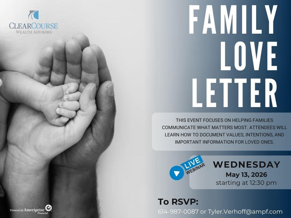 Family Love Letter Date: Wednesday, May 13, 2026 Time: 12:30 PM - 1:30 PM EDT ONLINE EVENT PASSCODE: 6pN6N5Lt Join this event online Presented By: Patrick Scorzelli, CFA, Advisor Consultant | Senior Vice President - Neuberger Berman Hosted By: ClearCourse Wealth Advisors This event focuses on helping families communicate what matters most. Attendees will learn how to document values, intentions, and important information for loved ones. To reserve a spot: call us at 614.987.0087 or email us at tyler.verhoff@ampf.com RSVP Online Event registration Date: Time: Enter your information below to RSVP for this event. We will contact you via phone or email to confirm your registration. First Name Last Name Email Phone (optional) Comments/Questions/Special Needs for the event (optional) Ameriprise Financial understands that privacy and security are important to you. We will only use the information to send offers we believe are relevant to you and, if you become a client, to send you information about your accounts. Visit the Email Preferences page to change your email choices. Submit Your RSVP was not sent. Return to form Thank you for your interest in this Ameriprise Financial event. We will contact you shortly to confirm your registration. Please note: Your registration is not complete until you have received final confirmation. Share Email Text message Facebook LinkedIn X Add to Calendar Google Calendar Yahoo! Calendar Share Email Text message Facebook LinkedIn X Add to Calendar Google Calendar Yahoo! Calendar This is an informational seminar, There is no cost orobligation. Neuberger Berman and its representatives are not affiliatedwith Ameriprise Financial. Investment products are not insured by the FDIC, NCUA or anyfederal agency, are not deposits or obligations of, or guaranteed by anyfinancial institution, and involve investment risks including possible loss ofprincipal and fluctuation in value. Securities offered by Ameriprise Financial Services, LLC.Member FINRA and SIPC. © 2026 Ameriprise Financial, Inc. All rights reserved. 8732116ACMR0126