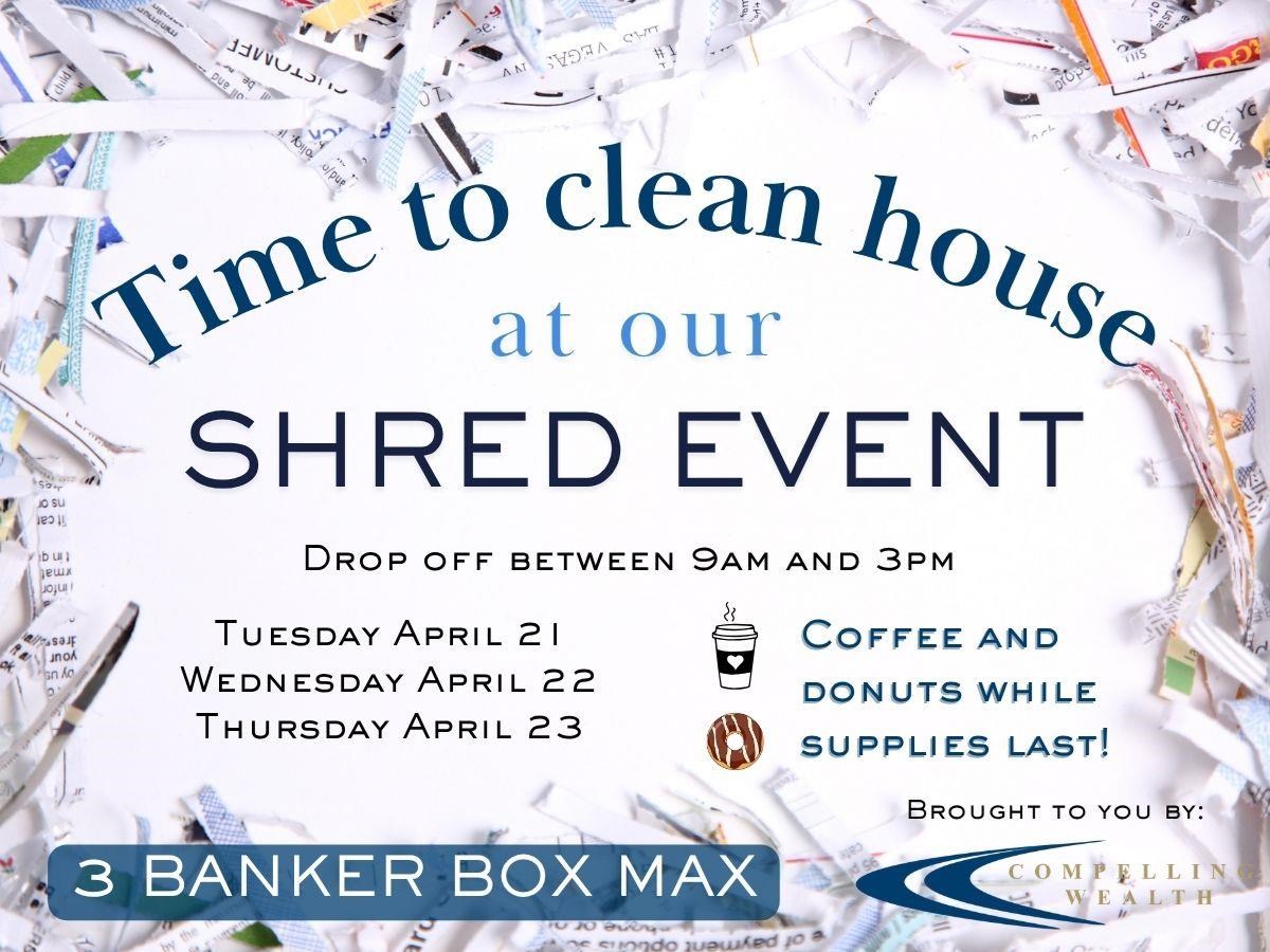 Shred Event! Date: Tuesday, April 21, 2026 Time: 9:00 AM - 3:30 PM CDT Location: Compelling Wealth Advisors, 2601 W Beltline Hwy, Ste 104, Madison, WI 53713 Hosted By: Compelling Wealth Advisors Sponsored By: Compelling Wealth Advisors Time to clean house after Tax Day! Drop off your documents to be securely shredded! Stop by anytime between 9am and 3pm on April 21st, 22nd or 23rd with your documents. Limit of 3 banker boxes per family please! We will also have donuts and coffee for you as a reward for all your hard work. For more information: call us at 608.819.0500 or email us at compellingwealth@ampf.com Share Email Text message Facebook LinkedIn X Add to Calendar Google Calendar Yahoo! Calendar