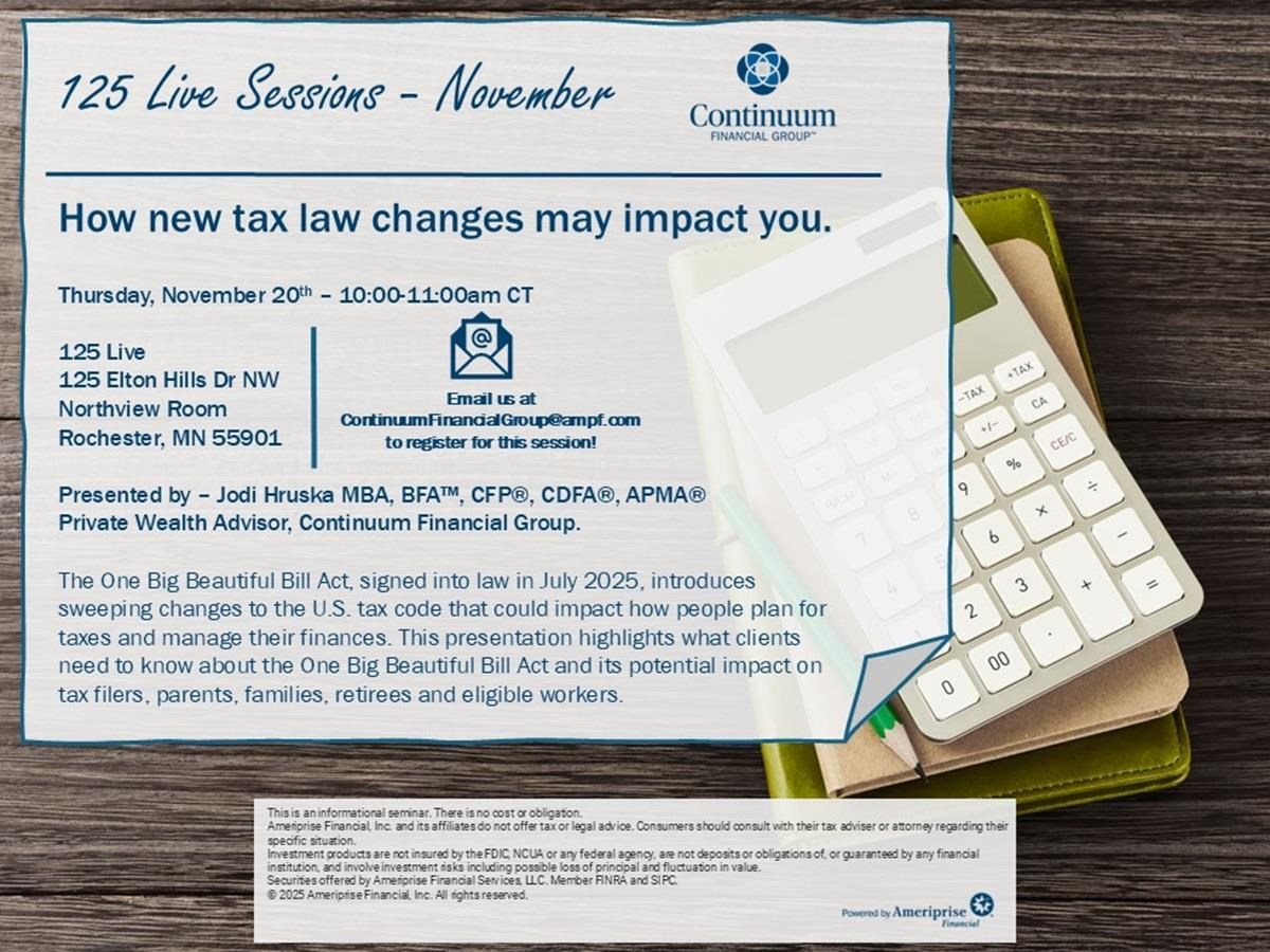 How New Tax Law Changes May Impact You Date: Thursday, November 20, 2025 Time: 10:00 AM - 11:00 AM CST Location: 125 Live, 125 Elton Hills Dr NW, Rochester , MN 55901 Presented By: Jodi Hruska MBA, BFA™, CFP®, CDFA®, APMA®, Private Wealth Advisor - Continuum Financial Group Hosted By: Continuum Financial Group The On Big Beautiful Bill Act, signed into law in July 2025, introduces sweeping changes to the U.S. tax code that could impact how people plan for taxes and manage their finances. This presentation highlights what clients need to know about the One Big Beautiful Bill Act and its potential impact on tax filers, parents, families, retirees and eligible workers. To reserve a spot: call us at 507.289.0737 or email us at continuumfinancialgroup@ampf.com Share Email Text message Facebook LinkedIn X Add to Calendar Google Calendar Yahoo! Calendar This is an informational seminar. There is no cost or obligation.Ameriprise Financial, Inc. and its affiliates do not offer tax or legal advice. Consumers should consult with their tax adviser or attorney regarding their specific situation.Investment products are not insured by the FDIC, NCUA or any federal agency, are not deposits or obligations of, or guaranteed by any financial institution, and involve investment risks including possible loss of principal and fluctuation in value. Securities offered by Ameriprise Financial Services, LLC. Member FINRA and SIPC.© 2025 Ameriprise Financial, Inc. All Rights Reserved