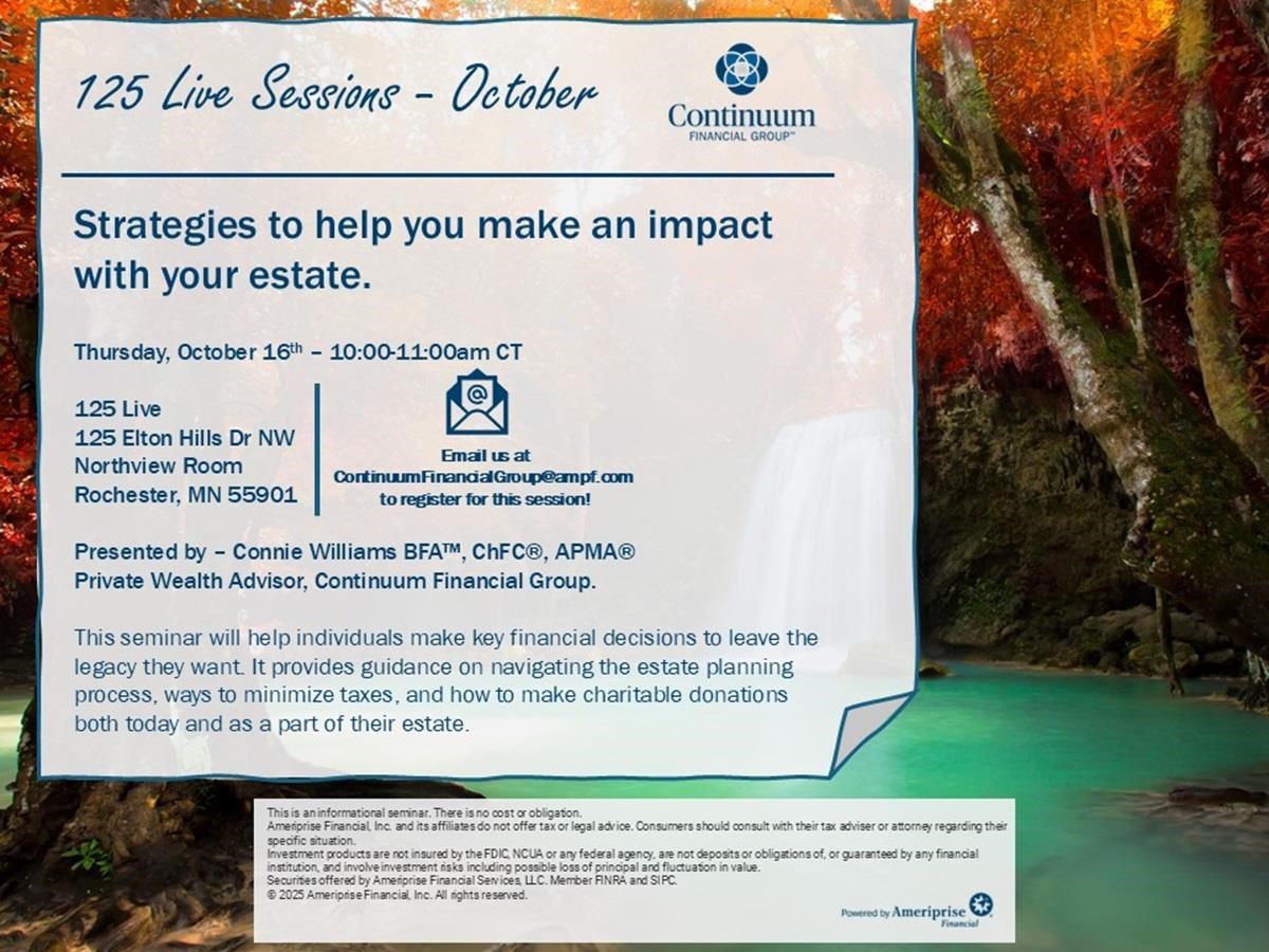 Strategies to help you make an impact with your estate. Date: Thursday, October 16, 2025 Time: 3:00 PM - 4:00 PM CDT Location: 125 Live, 125 Elton Hills Dr NW, Rochester , MN 55901 Presented By: Connie Williams BFA™, ChFC®, APMA® , Private Wealth Advisor - Continuum Financial Group Hosted By: Continuum Financial Group This seminar will help individuals make key financial decisions to leave the legacy they want. It provides guidance on navigating the estate planning process, ways to minimize taxes, and how to make charitable donations both today and as a part of their estate. To reserve a spot: call us at 507.289.0737 or email us at continuumfinancialgroup@ampf.com Share Email Text message Facebook LinkedIn X Add to Calendar Google Calendar Yahoo! Calendar This is an informational seminar. There is no cost or obligation. Ameriprise Financial, Inc. and its affiliates do not offer tax or legal advice. Consumers should consult with their tax adviser or attorney regarding their specific situation. Investment products are not insured by the FDIC, NCUA or any federal agency, are not deposits or obligations of, or guaranteed by any financial institution, and involve investment risks including possible loss of principal and fluctuation in value. Securities offered by Ameriprise Financial Services, LLC. Member FINRA and SIPC. ©2025 Ameriprise Financial, Inc. All rights reserved.