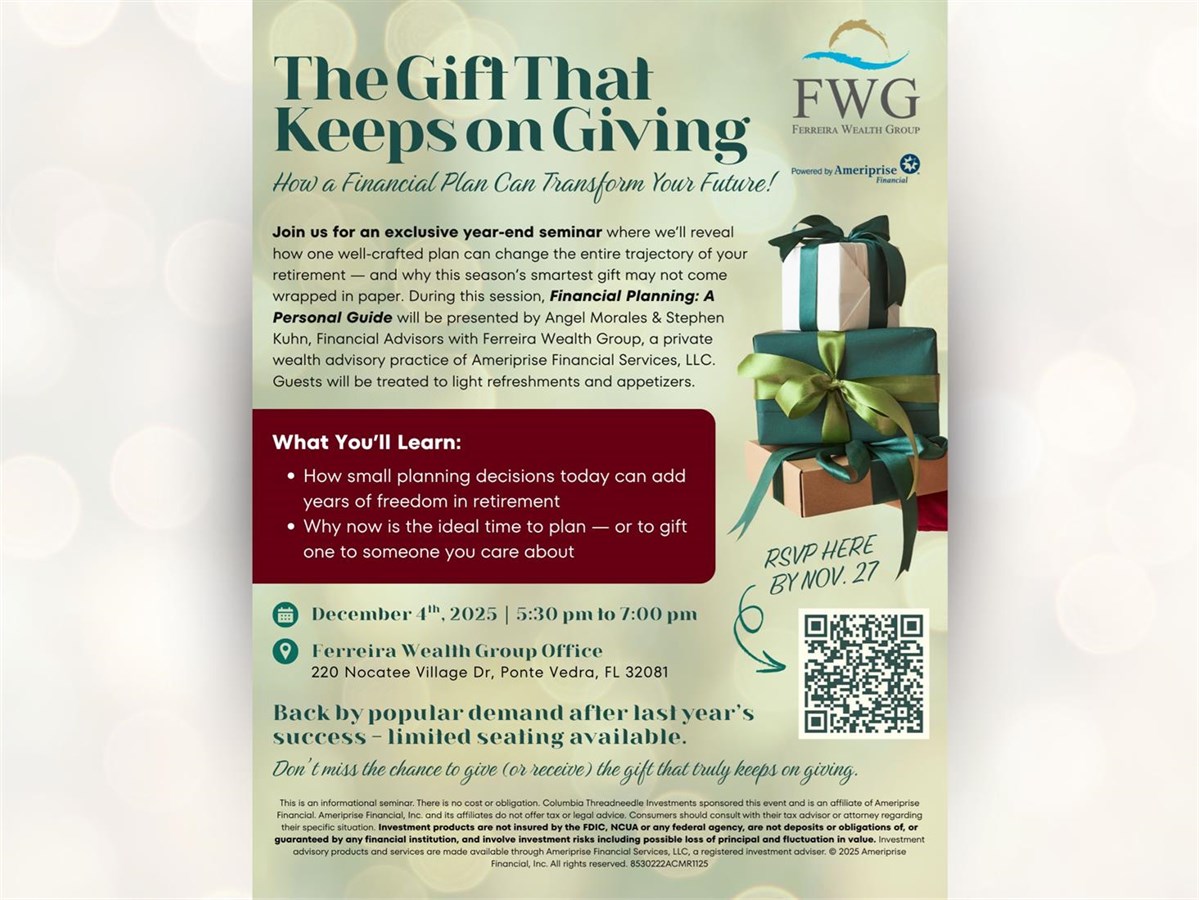 The Gift That Keeps on Giving: How a Financial Plan Can Transform Your Future! Date: Thursday, December 4, 2025 Time: 5:30 PM - 7:00 PM EST Location: Ferreira Wealth Group, 220 Nocatee Village Dr, Ponte Vedra, FL 32081 Presented By: Angel Morales & Stephen Kuhn, Financial Advisors - Ameriprise Financial Services, LLC Hosted By: Ferreira Wealth Group Sponsored By: Columbia Threadneedle Join us for an exclusive year-end seminar where we’ll reveal how one well-crafted plan can change the entire trajectory of your retirement — and why this season’s smartest gift may not come wrapped in paper. During this session, Financial Planning: A Personal Guide will be presented by Angel Morales & Stephen Kuhn, Financial Advisors with Ferreira Wealth Group, a private wealth advisory practice of Ameriprise Financial Services, LLC. Guests will be treated to light refreshments and appetizers. What You’ll Learn: How small planning decisions today can add years of freedom in retirement Why now is the ideal time to plan — or to gift one to someone you care about To reserve a spot: email us at madeline.castello@ampf.com RSVP Online Event registration Date: Time: Enter your information below to RSVP for this event. We will contact you via phone or email to confirm your registration. First Name Last Name Email Phone (optional) Comments/Questions/Special Needs for the event (optional) Ameriprise Financial understands that privacy and security are important to you. We will only use the information to send offers we believe are relevant to you and, if you become a client, to send you information about your accounts. Visit the Email Preferences page to change your email choices. Submit Your RSVP was not sent. Return to form Thank you for your interest in this Ameriprise Financial event. We will contact you shortly to confirm your registration. Please note: Your registration is not complete until you have received final confirmation. Share Email Text message Facebook LinkedIn X Add to Calendar Google Calendar Yahoo! Calendar Share Email Text message Facebook LinkedIn X Add to Calendar Google Calendar Yahoo! Calendar This is an informational seminar. There is no cost or obligation. Columbia Threadneedle Investments sponsored this event and is an affiliate of Ameriprise Financial. Ameriprise Financial, Inc. and its affiliates do not offer tax or legal advice. Consumers should consult with their tax advisor or attorney regarding their specific situation. Investment products are not insured by the FDIC, NCUA or any federal agency, are not deposits or obligations of, or guaranteed by any financial institution, and involve investment risks including possible loss of principal and fluctuation in value. Investment advisory products and services are made available through Ameriprise Financial Services, LLC, a registered investment adviser. © 2025 Ameriprise Financial, Inc. All rights reserved. 8530222ACMR1125