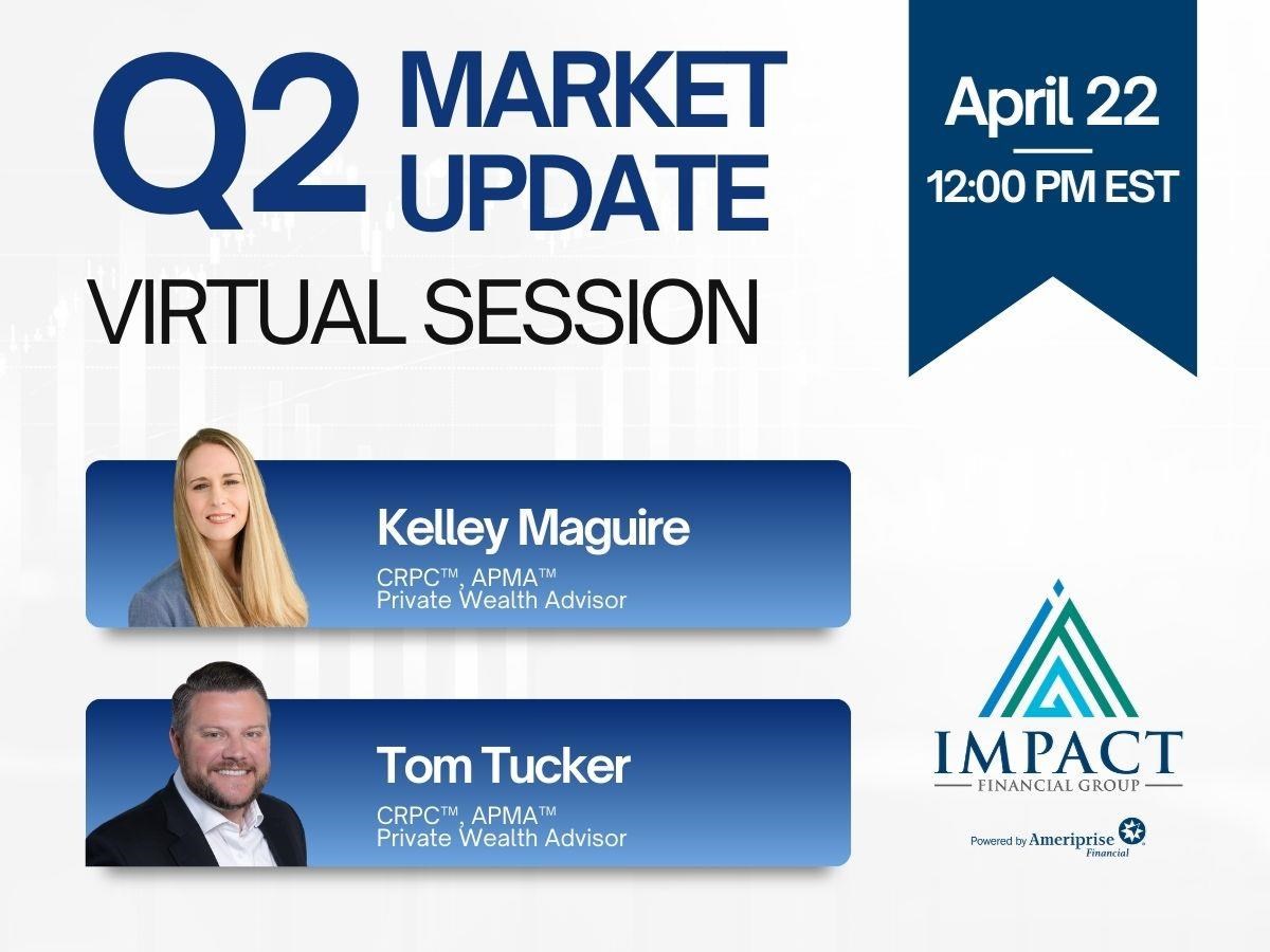 Q2 Market Update Date: Wednesday, April 22, 2026 Time: 12:00 PM - 12:30 PM EDT You must RSVP to receive access credentials for this event or seminar. Presented By: Kelley Maguire, CRPC™, APMA™, Private Wealth Advisor, and Tom Tucker, CRPC™, APMA™, Private Wealth Advisor Hosted By: Impact Financial Group, a private wealth advisory practice of Ameriprise Financial Services, LLC Learn How Recent Events Can Impact Your Finances Impact Financial Group, a private wealth advisory practice of Ameriprise Financial Services, LLC, invites you to a Virtual Market Update. Join your hosts Kelley Maguire, CRPC™, APMA™, Private Wealth Advisor, and Tom Tucker, CRPC™, APMA™, Private Wealth Advisor, as they share timely insights on recent market activity and what it could mean for you.During this complimentary session, you’ll hear: Factors that may contribute to market volatility Strategies to help weather market uncertainty Whether you're a long-time client or exploring your financial options, this event is designed to help you feel informed and empowered in today’s dynamic market environment. To reserve a spot: email us at impactfinancialgroup@ampf.com Share Email Text message Facebook LinkedIn X Add to Calendar Google Calendar Yahoo! Calendar This is an informational seminar. There is no cost or obligation. Investment products are not insured by the FDIC, NCUA or any federal agency, are not deposits or obligations of, or guaranteed by any financial institution, and involve investment risks including possible loss of principal and fluctuation in value. Securities offered by Ameriprise Financial Services, LLC. Member FINRA and SIPC. © 2026 Ameriprise Financial, Inc. All rights reserved. 8395707ACMR0925