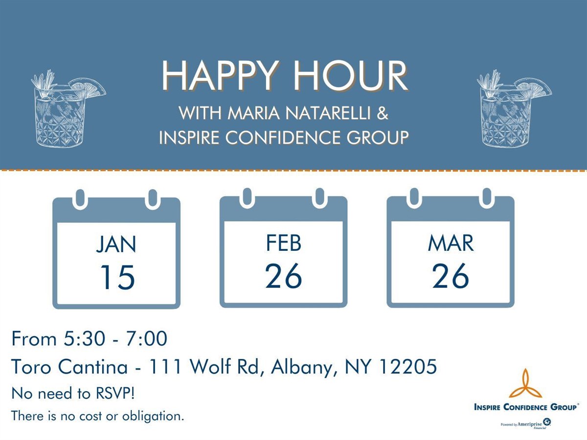Inspire Confidence Group Monthly Happy Hour Date: Thursday, January 15, 2026 Time: 5:30 PM - 7:00 PM EST Location: Toro Cantina, 111 Wolf Road, Albany, NY 12205 Hosted By: Maria Natarelli, Private Wealth Advisor and Managing Partner, Inspire Confidence Group, A private wealth advisory practice of Ameriprise Financial Services, LLC Inspire Confidence Group is hosting monthly happy hours! Please consider bringing a friend and join us at Toro Cantina in Albany! For more information: call us at 518.459.5500 or email us at alison.orr@ampf.com Share Email Text message Facebook LinkedIn X Add to Calendar Google Calendar Yahoo! Calendar