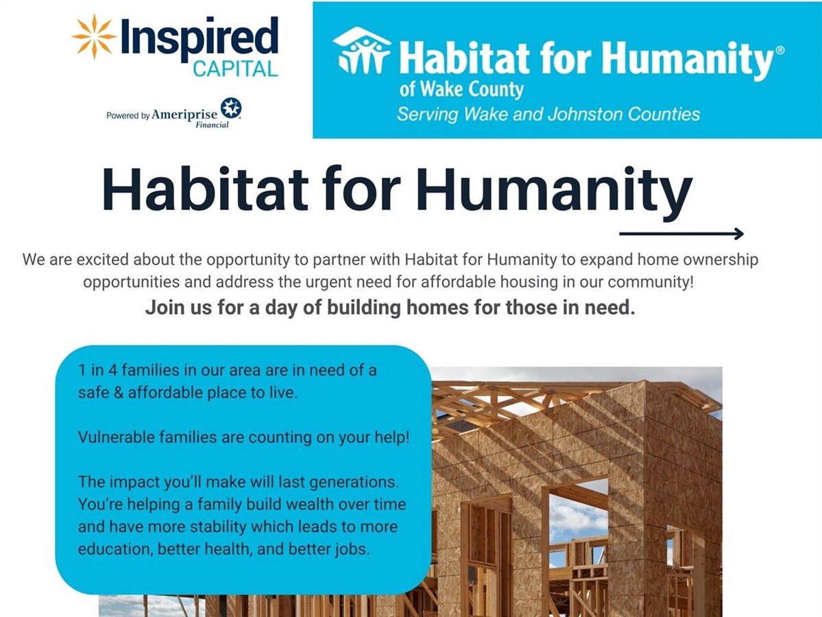 Habitat for Humanity Date: Thursday, June 18, 2026 Time: 8:15 AM - 3:30 PM EDT Location: Old Poole Place, 925 Ridge Rock Rd., Raleigh, NC 27610 Hosted By: Inspired Capital, a private wealth advisory practice of Ameriprise Financial LLC We are excited about the opportunity to partner with Habitat for Humanity to expand home ownership opportunities and address the urgent need for affordable housing in our community! Join us for a day of building homes for those in need. Old Poole Place is a development of 114 single and multi-family homes in Southeast Raleigh. Construction began in March 2023 and is ongoing. To reserve a spot: email us at inspiredcapital@ampf.com Share Email Text message Facebook LinkedIn X Add to Calendar Google Calendar Yahoo! Calendar There is no cost or obligation to attend. Habitat for Humanity is not affiliated with Ameriprise Financial.