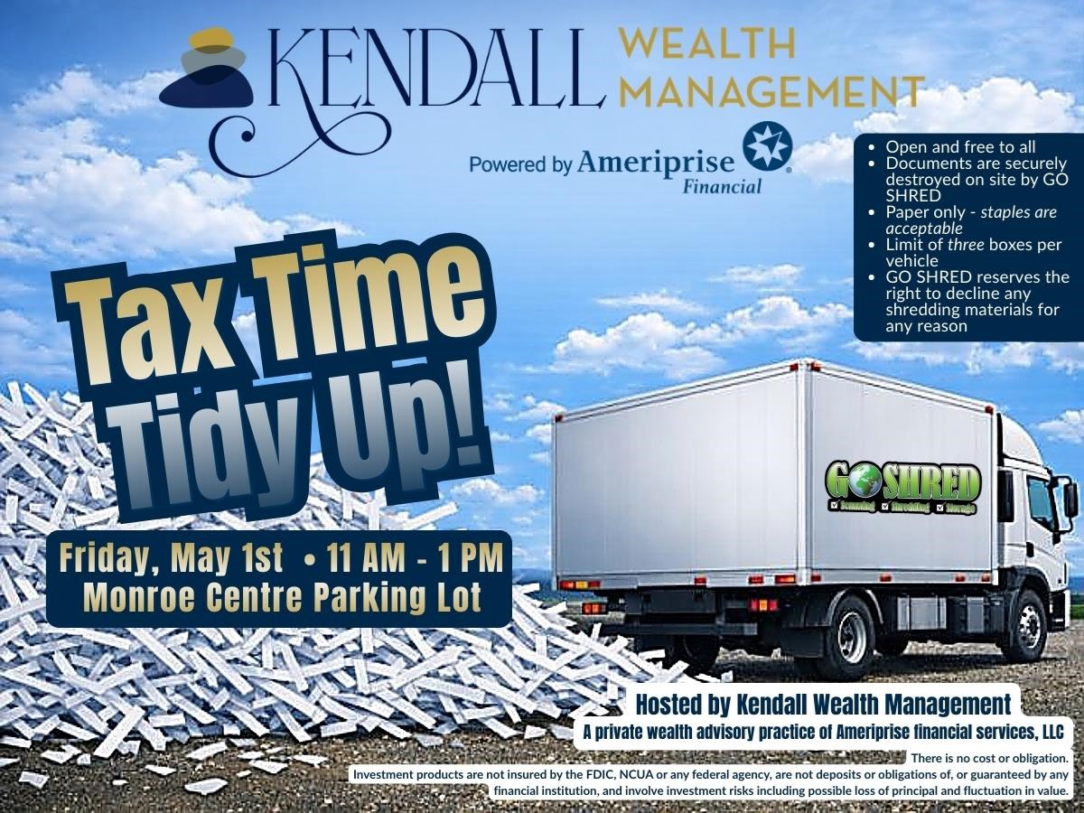 Tax Time Tidy Up Date: Friday, May 1, 2026 Time: 11:00 AM - 1:00 PM EDT Location: Monroe Centre Parking Lot, 1260 Monroe St NW, New Philadelphia, OH 44663 Hosted By: Kendall Wealth Management Join us for a complimentary Community Shred Event to help individuals and families securely dispose of sensitive documents following tax season. Documents will be securely shredded on-site by GO SHRED, a professional shredding service. Staples and paper clips are accepted, with a limit of three boxes per vehicle. For more information: call us at 330.440.7636 Share Email Text message Facebook LinkedIn X Add to Calendar Google Calendar Yahoo! Calendar