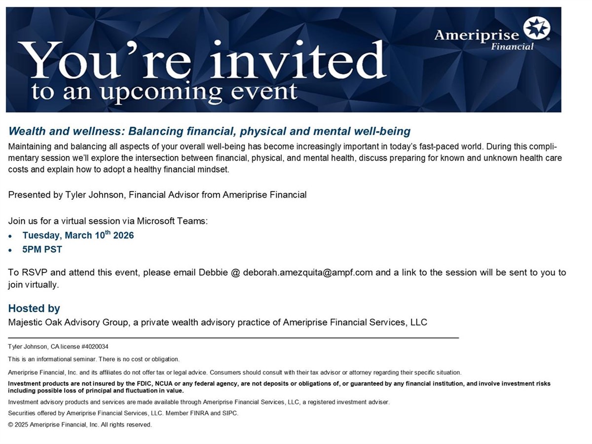 Wealth and wellness: Balancing financial, physical and mental well-being Date: Tuesday, March 10, 2026 Time: 5:00 PM - 6:00 PM PDT You must RSVP to receive access credentials for this event or seminar. Presented By: Tyler Johnson, Financial Advisor - Ameriprise Financial Hosted By: Majestic Oak Advisory Group Sponsored By: Majestic Oak Advisory Group Maintaining and balancing all aspects of your overall well-being has become increasingly important in today’s fast-paced world. During this complimentary session we’ll explore the intersection between financial, physical, and mental health, discuss preparing for known and unknown health care costs and explain how to adopt a healthy financial mindset. Tyler Johnson, CA license #4020034 This is an informational seminar. There is no cost or obligation. Ameriprise Financial, Inc. and its affiliates do not offer tax or legal advice. Consumers should consult with their tax advisor or attorney regarding their specific situation. Investment products are not insured by the FDIC, NCUA or any federal agency, are not deposits or obligations of, or guaranteed by any financial institution, and involve investment risks including possible loss of principal and fluctuation in value. Investment advisory products and services are made available through Ameriprise Financial Services, LLC, a registered investment adviser. Securities offered by Ameriprise Financial Services, LLC. Member FINRA and SIPC. © 2025 Ameriprise Financial, Inc. All rights reserved.