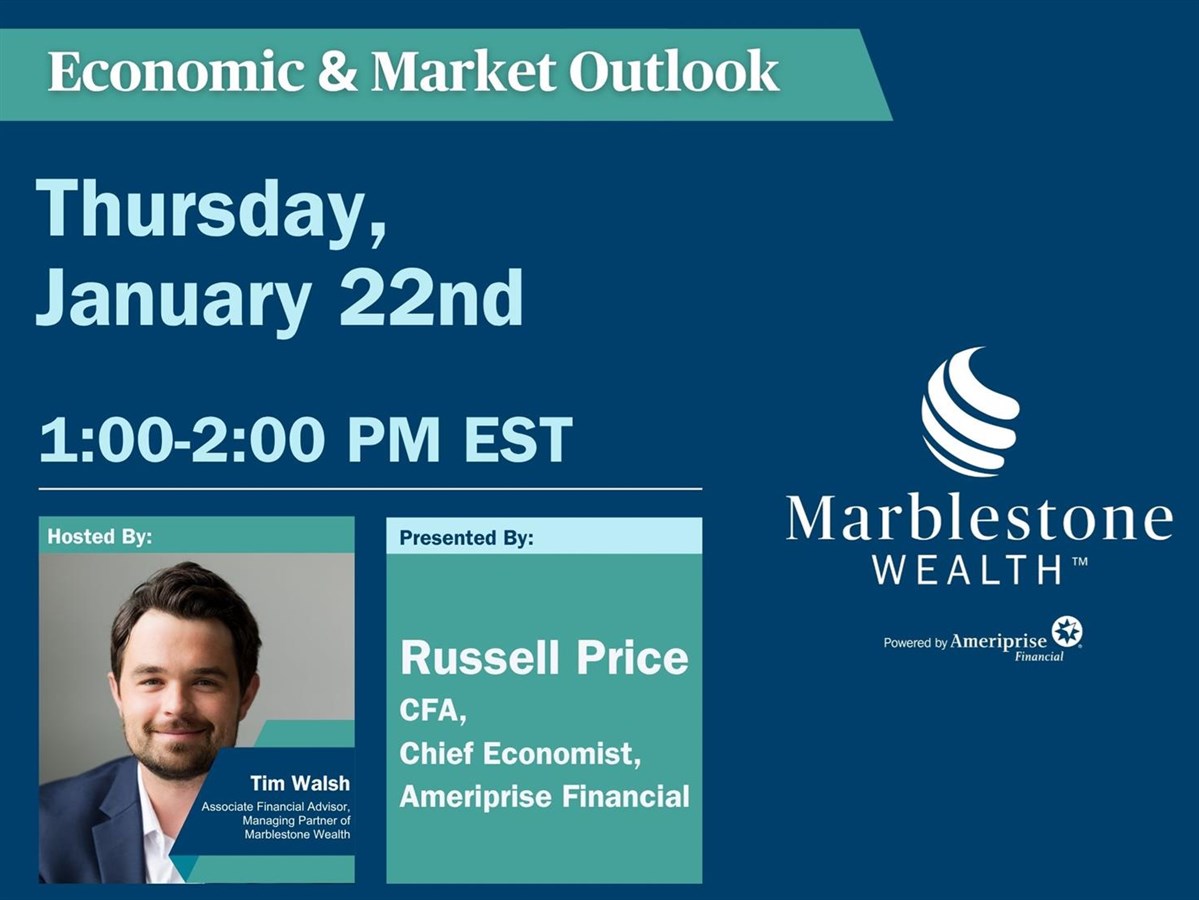 Economic and Market Update Date: Thursday, January 22, 2026 Time: 1:00 PM - 2:00 PM EST You must RSVP to receive access credentials for this event or seminar. Presented By: Russell Price, CFA, Chief Economist - Ameriprise Financial Hosted By: Timothy Walsh; Associate Financial Advisor | Managing Partner of Marblestone Wealth Sponsored By: Marblestone Wealth, a private wealth advisory practice of Ameriprise Financial Services, LLC Russell will share his expert insights on the general market outlook, current market conditions, and potential investment implications. Following the presentation, there will be a brief Q&A session, giving attendees the opportunity to ask questions and gain further clarity on the topics discussed. To reserve a spot: call us at 802.654.8800 or email us at marblestonewealth@ampf.com RSVP Online Event registration Date: Time: Enter your information below to RSVP for this event. We will contact you via phone or email to confirm your registration. First Name Last Name Email Phone (optional) Comments/Questions/Special Needs for the event (optional) Ameriprise Financial understands that privacy and security are important to you. We will only use the information to send offers we believe are relevant to you and, if you become a client, to send you information about your accounts. Visit the Email Preferences page to change your email choices. Submit Your RSVP was not sent. Return to form Thank you for your interest in this Ameriprise Financial event. We will contact you shortly to confirm your registration. Please note: Your registration is not complete until you have received final confirmation. Share Email Text message Facebook LinkedIn X Add to Calendar Google Calendar Yahoo! Calendar Share Email Text message Facebook LinkedIn X Add to Calendar Google Calendar Yahoo! Calendar This is an informational seminar. There is no cost or obligation.