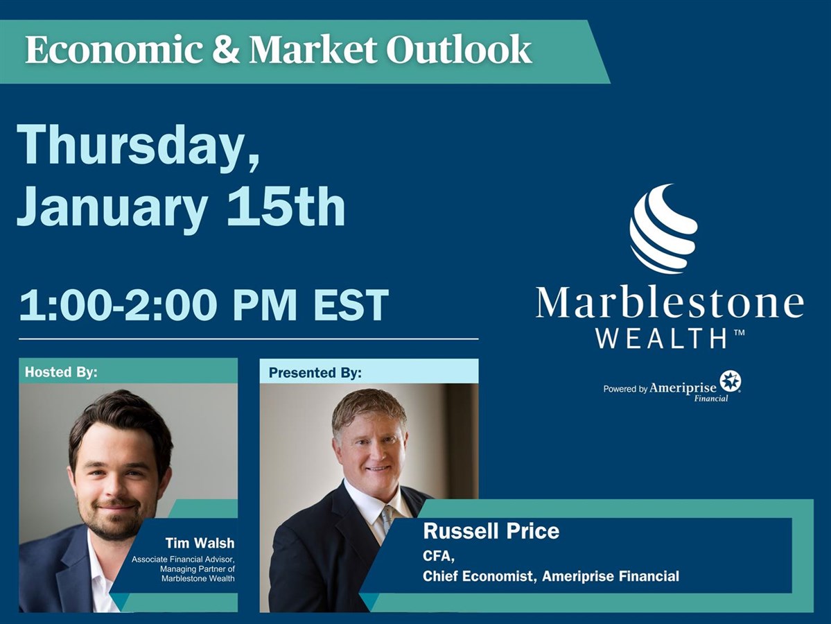 Economic and Market Update Date: Thursday, January 15, 2026 Time: 1:00 PM - 2:00 PM EST You must RSVP to receive access credentials for this event or seminar. Presented By: Russell Price, CFA, Chief Economist - Ameriprise Financial Hosted By: Timothy Walsh; Associate Financial Advisor | Managing Partner of Marblestone Wealth Sponsored By: Marblestone Wealth, a private wealth advisory practice of Ameriprise Financial Services, LLC Russell will share his expert insights on the general market outlook, current market conditions, and potential investment implications. Following the presentation, there will be a brief Q&A session, giving attendees the opportunity to ask questions and gain further clarity on the topics discussed. To reserve a spot: call us at 802.654.8800 or email us at marblestonewealth@ampf.com RSVP Online Event registration Date: Time: Enter your information below to RSVP for this event. We will contact you via phone or email to confirm your registration. First Name Last Name Email Phone (optional) Comments/Questions/Special Needs for the event (optional) Ameriprise Financial understands that privacy and security are important to you. We will only use the information to send offers we believe are relevant to you and, if you become a client, to send you information about your accounts. Visit the Email Preferences page to change your email choices. Submit Your RSVP was not sent. Return to form Thank you for your interest in this Ameriprise Financial event. We will contact you shortly to confirm your registration. Please note: Your registration is not complete until you have received final confirmation. Share Email Text message Facebook LinkedIn X Add to Calendar Google Calendar Yahoo! Calendar Share Email Text message Facebook LinkedIn X Add to Calendar Google Calendar Yahoo! Calendar This is an informational seminar. There is no cost or obligation.