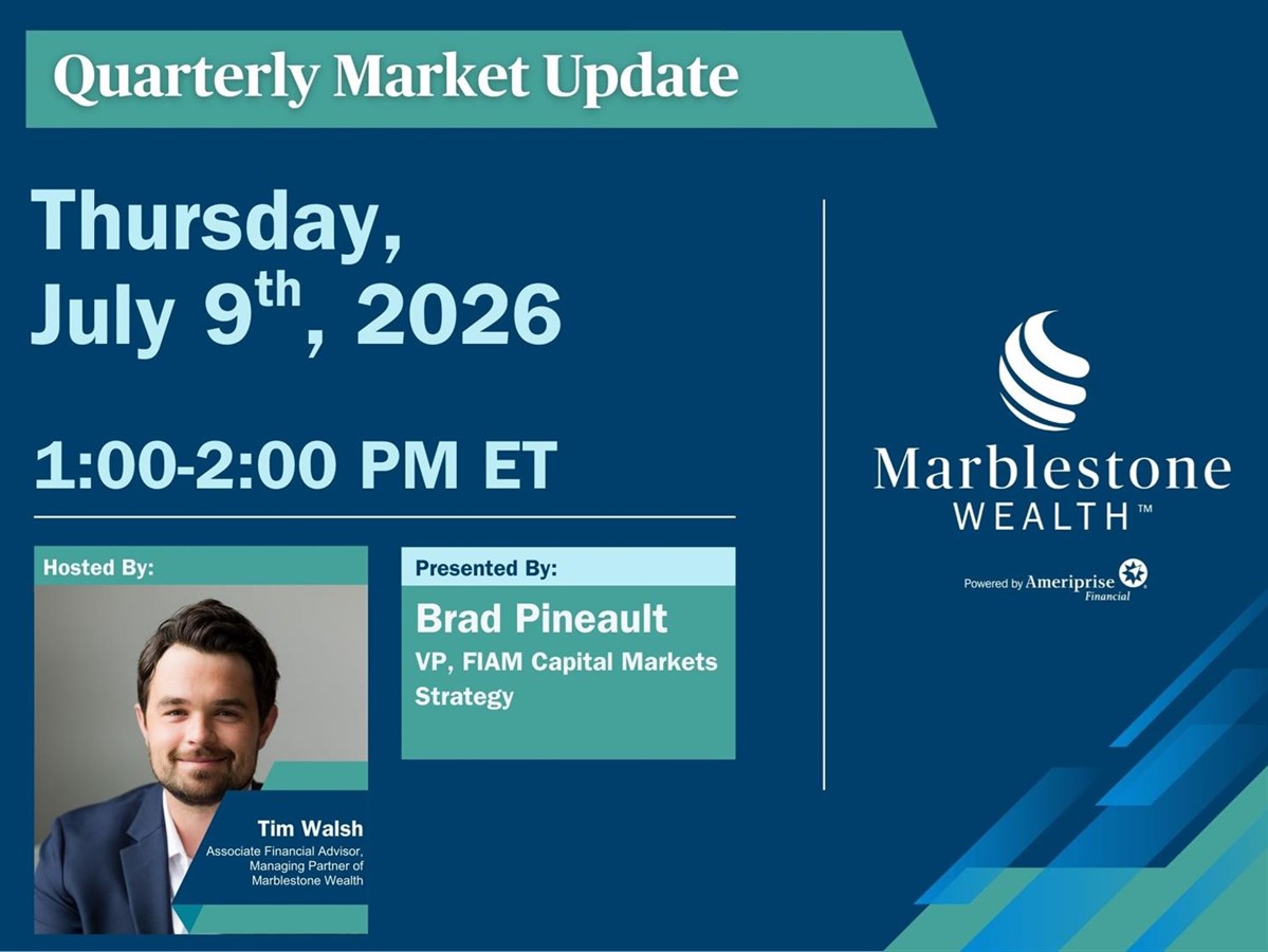 Quarterly Market Update Date: Thursday, July 9, 2026 Time: 1:00 PM - 2:00 PM EDT You must RSVP to receive access credentials for this event or seminar. Presented By: Brad Pineault, VP, FIAM Capital Markets Strategy - Fidelity Hosted By: Tim Walsh, Associate Financial Advisor Sponsored By: Marblestone Wealth, a private wealth advisory practice of Ameriprise Financial Services, LLC Brad will provide a timely overview of the economic landscape, market performance, and factors shaping investor sentiment, including inflation trends, interest rate outlook, sector performance, and global developments. The session will conclude with an interactive Q&A so you can get your questions answered. To reserve a spot: call us at 802.654.8800 or email us at marblestonewealth@ampf.com RSVP Online Event registration Date: Time: Enter your information below to RSVP for this event. We will contact you via phone or email to confirm your registration. First Name Last Name Email Phone (optional) Comments/Questions/Special Needs for the event (optional) Ameriprise Financial understands that privacy and security are important to you. We will only use the information to send offers we believe are relevant to you and, if you become a client, to send you information about your accounts. Visit the Email Preferences page to change your email choices. Submit Your RSVP was not sent. Return to form Thank you for your interest in this Ameriprise Financial event. We will contact you shortly to confirm your registration. Please note: Your registration is not complete until you have received final confirmation. Share Email Text message Facebook LinkedIn X Add to Calendar Google Calendar Yahoo! Calendar Share Email Text message Facebook LinkedIn X Add to Calendar Google Calendar Yahoo! Calendar