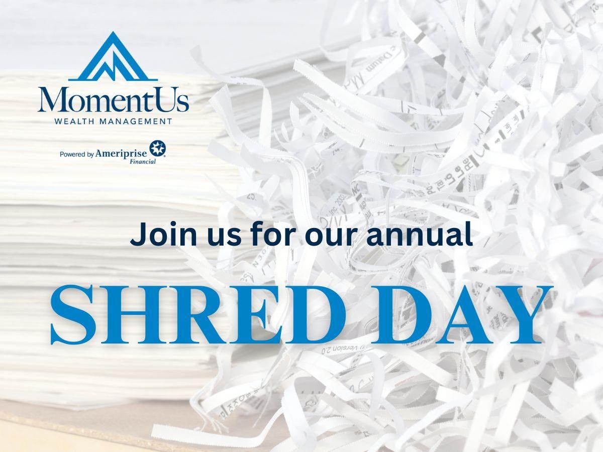 MomentUs Wealth Management Shred Day Date: Saturday, April 25, 2026 Time: 9:00 AM - 11:00 AM CDT Location: MomentUs Wealth Management, 1608 Airport Freeway, Bedford, TX 76022 Hosted By: MomentUs Wealth Management Do you have old bills, receipts, or other important documents cluttering up your files that you’d like to get rid of? Join us for a free shredding event. A professional shredding company will be on site to safely and securely shred your documents. Refreshments will be provided. To reserve a spot: call us at 817.580.7000 or email us at mindy.c.whatley@ampf.com RSVP Online Event registration Date: Time: Enter your information below to RSVP for this event. We will contact you via phone or email to confirm your registration. First Name Last Name Email Phone (optional) Comments/Questions/Special Needs for the event (optional) Ameriprise Financial understands that privacy and security are important to you. We will only use the information to send offers we believe are relevant to you and, if you become a client, to send you information about your accounts. Visit the Email Preferences page to change your email choices. Submit Your RSVP was not sent. Return to form Thank you for your interest in this Ameriprise Financial event. We will contact you shortly to confirm your registration. Please note: Your registration is not complete until you have received final confirmation. Share Email Text message Facebook LinkedIn X Add to Calendar Google Calendar Yahoo! Calendar Share Email Text message Facebook LinkedIn X Add to Calendar Google Calendar Yahoo! Calendar Ameriprise Financial and its affiliates do not offer tax or legal advice. Consumers should consult with their tax advisor or attorney regarding their specific situation.