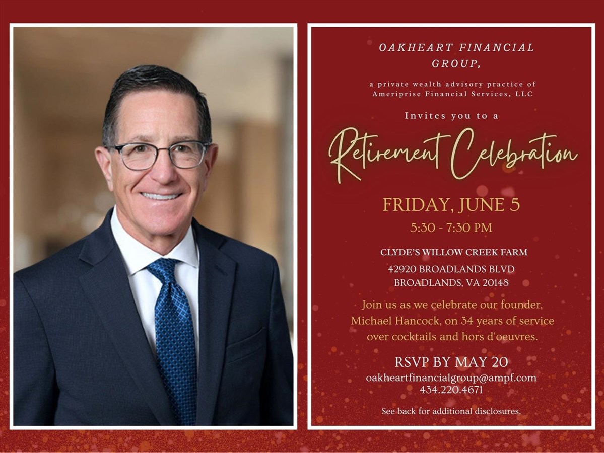 Michael Hancock's Retirement Celebration - Northern VA Date: Friday, June 5, 2026 Time: 5:30 PM - 7:30 PM EDT Location: Clyde's Willow Creek Farm, 42920 Broadlands Boulevard, Broadlands, VA 20148 Hosted By: OakHeart Financial Group, a private wealth advisory practice of Ameriprise Financial Services, LLC. Join us as we celebrate Michael Hancock, founder of OakHeart Financial Group on his retirement after over 3 decades of excellent service and dedication. For more information: call us at 434.220.4671 or email us at oakheartfinancialgroup@ampf.com Share Email Text message Facebook LinkedIn X Add to Calendar Google Calendar Yahoo! Calendar There is no cost or obligation.