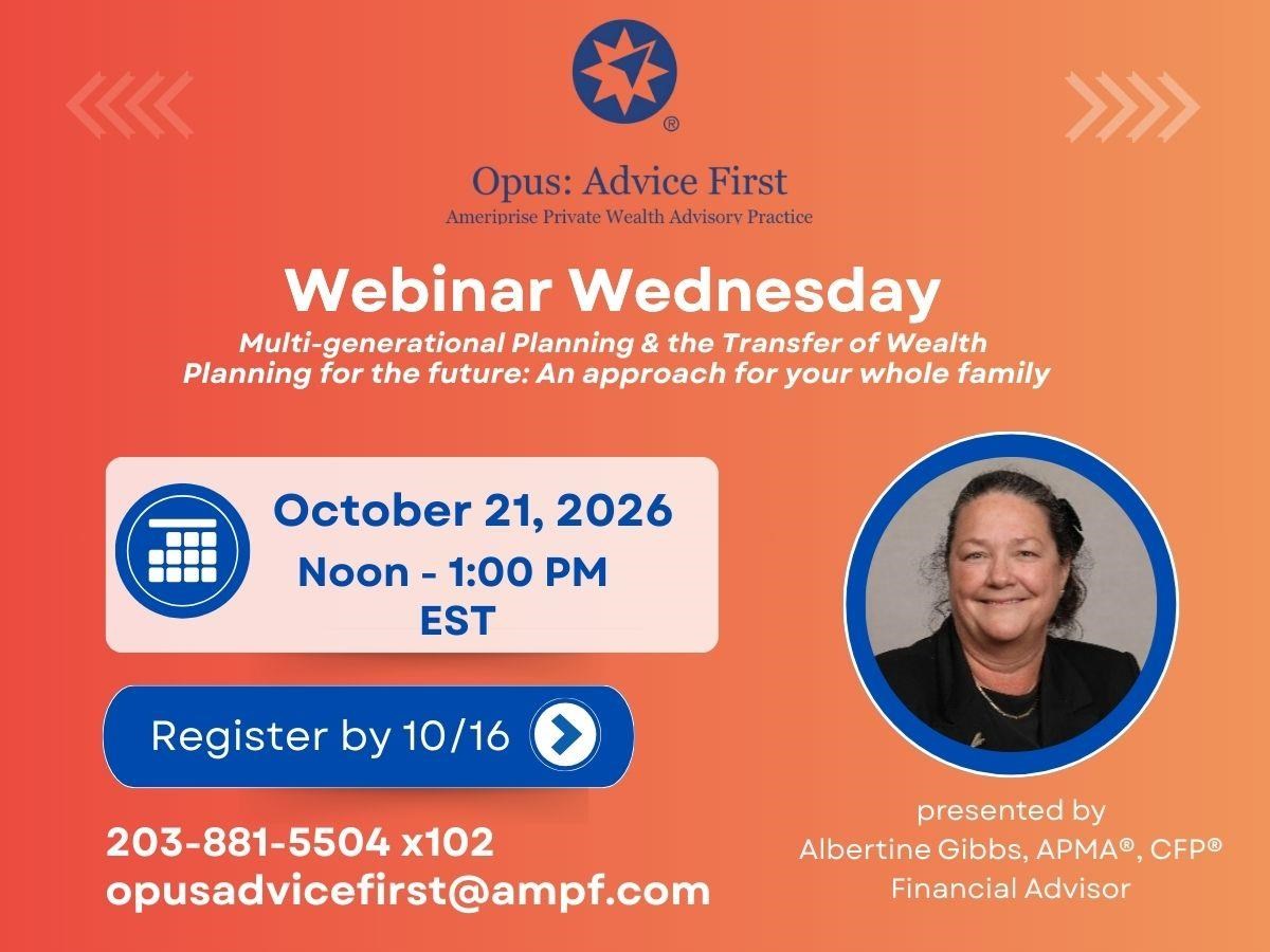 Opus: Advice First presents: Webinar Wednesday Date: Wednesday, October 21, 2026 Time: 12:00 PM - 1:00 PM EDT You must RSVP to receive access credentials for this event or seminar. Presented By: Albertine Gibbs, APMA, Financial Advisor - Opus: Advice First Hosted By: Opus: Advice First Opus: Advice First presents: Webinar Wednesday To reserve a spot: call us at 203.881.5504 Ext. 102 or email us at kimberly.killoy@ampf.com Share Email Text message Facebook LinkedIn X Add to Calendar Google Calendar Yahoo! Calendar This is an informational seminar. There is no cost or obligation. Investment products are not insured by the FDIC, NCUA or any federal agency, are not deposits or obligations of, or guaranteed by any financial institution, and involve investment risk including possible loss of principal and fluctuation in value. Certified Financial Planner Board of Standards Inc. owns the certification marks CFP®, CERTIFIED FINANCIAL PLANNER® and CFP® certification mark (with plaque design) logo in the U.S. The Compass is a trademark of Ameriprise Financial, Inc. Opus: Advice First, a private wealth advisory practice of Ameriprise Financial Services, LLC. Securities offered by Ameriprise Financial Services, LLC. Member FINRA and SPIC. © 2026 Ameriprise Financial, Inc. All rights reserved. 8790625ACMR0326