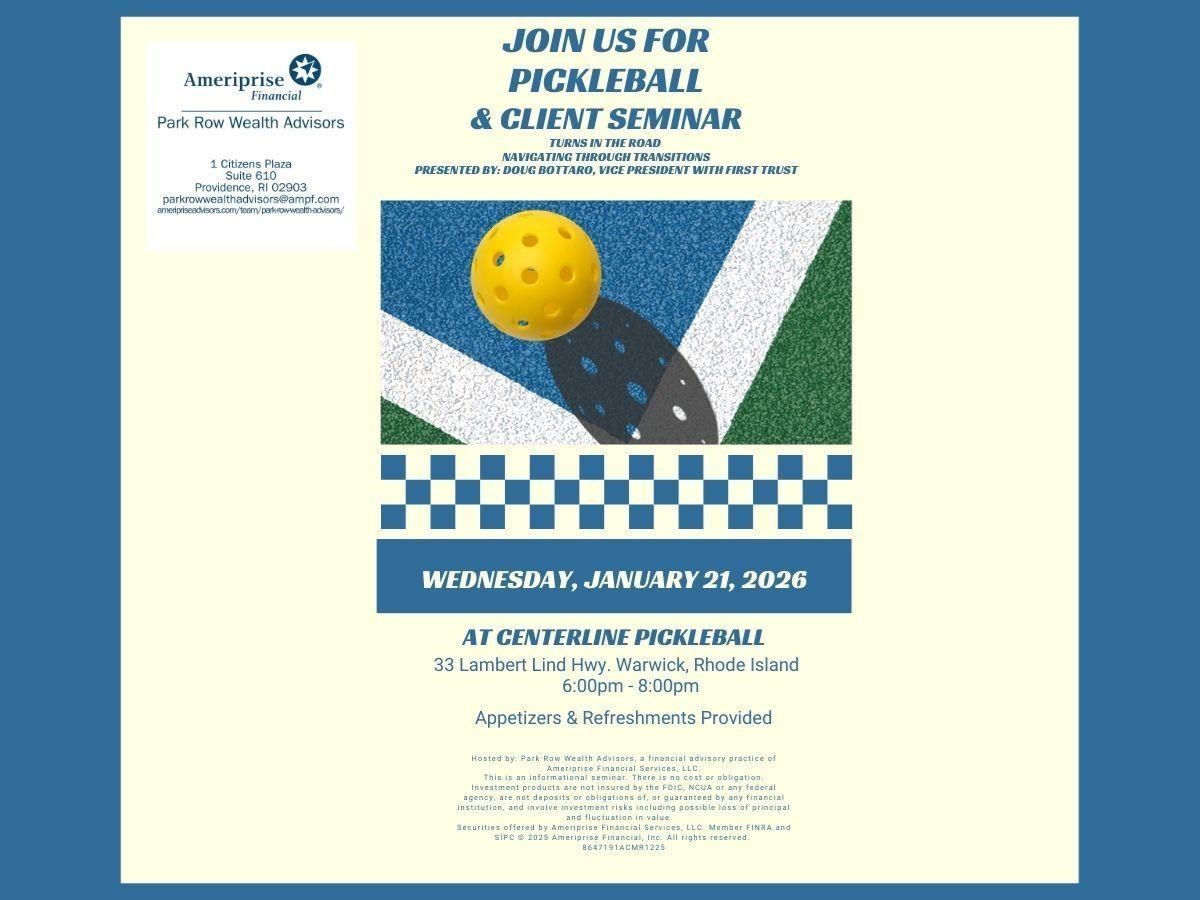 Join us for Pickleball & Client Seminar Date: Wednesday, January 21, 2026 Time: 6:00 PM - 8:00 PM EST Location: Centerline Pickleball, 33 Lambert Lind Highway, Warwick, RI 02886 Presented By: Doug Bottaro, Vice president - First Trust Hosted By: Park Row Wealth Advisors Join us on January 21st, 2026, for an exciting Pickleball Event coupled with an insightful seminar, "Turns in The Road: Navigating Through Transitions," presented by Doug Bottaro. This unique gathering will feature a lively pickleball tournament, providing a fun and engaging way to connect with fellow participants. Following the games, Doug Bottaro will share his expertise on managing life’s transitions, offering valuable strategies to navigate change effectively.Whether you're a seasoned player or new to the sport, this event promises to enhance your skills on the court while equipping you with essential tools for personal and professional growth. Don't miss this opportunity to combine fitness, fun, and impactful learning! To reserve a spot: call us at 401.824.2527 or email us at alexia.moronta@ampf.comEvent Description (required); max 1,500 characters Hosted by: Park Row Wealth Advisors, a financial advisory practice of Ameriprise Financial Services, LLC. This is an informational seminar. There is no cost or obligation. Investment products are not insured by the FDIC, NCUA or any federal agency, are not deposits or obligations of, or guaranteed by any financial institution, and involve investment risks including possible loss of principal and fluctuation in value. Securities offered by Ameriprise Financial Services, LLC. Member FINRA and SIPC © 2025 Ameriprise Financial, Inc. All rights reserved. 8647191ACMR1225