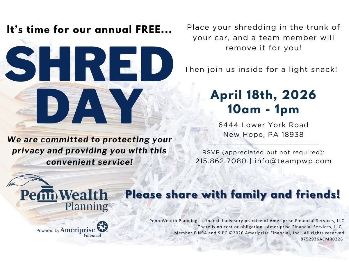 Penn Wealth Planning's Annual Shred Day! Date: Saturday, April 18, 2026 Time: 10:00 AM - 1:00 PM EDT Location: Penn Wealth Planning, 6444 Lower York Rd, New Hope, PA 18938 Hosted By: Penn Wealth Planning, a financial advisory practice of Ameriprise Financial Services, LLC. We are committed to protecting your privacy and providing you with this helpful and convenient FREE service every year. Please feel free to share with family and friends! As in recent years, we will continue to offer drive-up service – place your shredding in the trunk of your car and a team member will remove it for you. We also welcome you to stay for a bit and catch up! We will have light snacks available inside our office building, so stop in and say “hello!”. To reserve a spot: call us at 215.862.7080 or email us at info@teampwp.com RSVP Online Event registration Date: Time: Enter your information below to RSVP for this event. We will contact you via phone or email to confirm your registration. First Name Last Name Email Phone (optional) Comments/Questions/Special Needs for the event (optional) Ameriprise Financial understands that privacy and security are important to you. We will only use the information to send offers we believe are relevant to you and, if you become a client, to send you information about your accounts. Visit the Email Preferences page to change your email choices. Submit Your RSVP was not sent. Return to form Thank you for your interest in this Ameriprise Financial event. We will contact you shortly to confirm your registration. Please note: Your registration is not complete until you have received final confirmation. Share Email Text message Facebook LinkedIn X Add to Calendar Google Calendar Yahoo! Calendar Share Email Text message Facebook LinkedIn X Add to Calendar Google Calendar Yahoo! Calendar