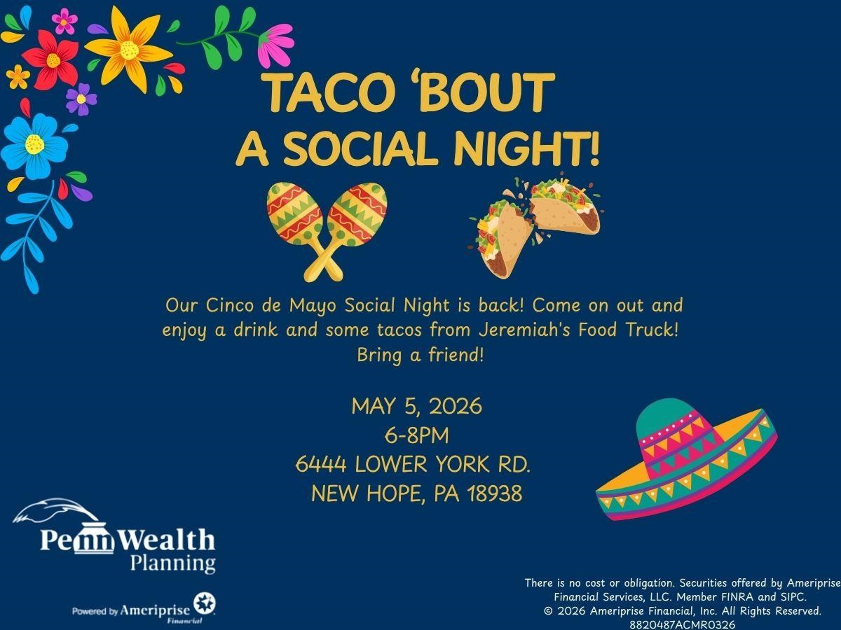 Cinco de Mayo Social Night Date: Tuesday, May 5, 2026 Time: 6:00 PM - 8:00 PM EDT Location: Penn Wealth Planning, 6444 Lower York Rd., New Hope, PA 18938 Hosted By: Penn Wealth Planning, A financial advisory practice of Ameriprise Financial Services, LLC Let’s eat some tacos and fiesta! Please bring a friend and join us on May 5th! To reserve a spot: call us at 215.862.7080 or email us at info@teampwp.com RSVP Online Event registration Date: Time: Enter your information below to RSVP for this event. We will contact you via phone or email to confirm your registration. First Name Last Name Email Phone (optional) Comments/Questions/Special Needs for the event (optional) Ameriprise Financial understands that privacy and security are important to you. We will only use the information to send offers we believe are relevant to you and, if you become a client, to send you information about your accounts. Visit the Email Preferences page to change your email choices. Submit Your RSVP was not sent. Return to form Thank you for your interest in this Ameriprise Financial event. We will contact you shortly to confirm your registration. Please note: Your registration is not complete until you have received final confirmation. Share Email Text message Facebook LinkedIn X Add to Calendar Google Calendar Yahoo! Calendar Share Email Text message Facebook LinkedIn X Add to Calendar Google Calendar Yahoo! Calendar