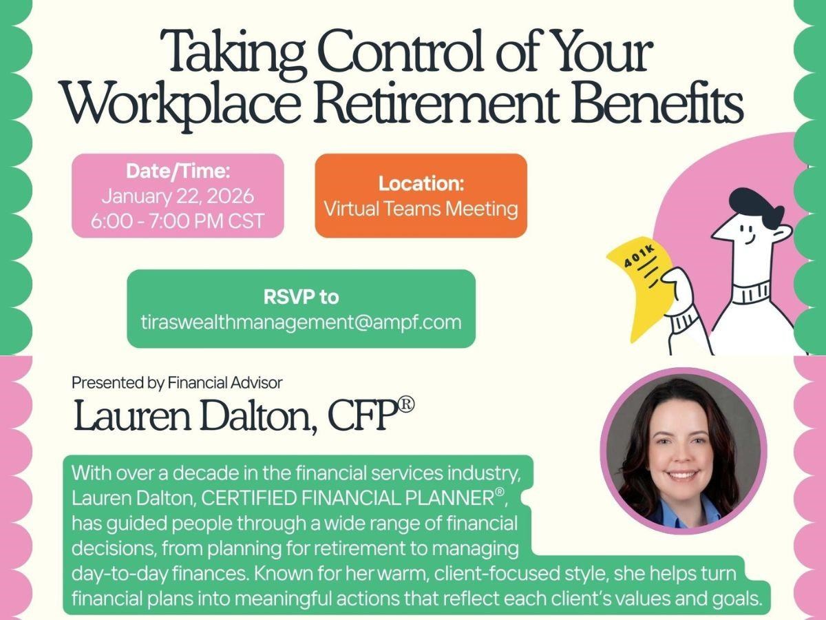 Taking Control of Your Workplace Retirement Benefits Date: Thursday, January 22, 2026 Time: 6:00 PM - 7:00 PM CST You must RSVP to receive access credentials for this event or seminar. Presented By: Lauren Dalton, CFP®, CFP®, Financial Advisor Hosted By: Tiras Wealth Management Whether you’re contributing for the first time or reassessing your strategy, this session will help you better understand your workplace retirement benefits – and the simple steps that can make a meaningful difference over time. During this complimentary session we’ll discuss why your future financial security, and your retirement lifestyle depend on how you save and invest. We’ll address key questions that drive the retirement planning process, make sure you understand your company retirement benefits, and we’ll offer some simple steps you can take to control your financial situation. To reserve a spot: email us at tiraswealthmanagement@ampf.com Share Email Text message Facebook LinkedIn X Add to Calendar Google Calendar Yahoo! Calendar This is an informational seminar. There is no cost or obligation. Certified Financial Planner Board of Standards Inc. owns the certification marks CFP®, CERTIFIED FINANCIAL PLANNER(R) and CFP certification mark (with plaque design) in the U.S. Investment products are not insured by the FDIC, NCUA or any federal agency, are not deposits or obligations of, or guaranteed by any financial institution, and involve investment risks including possible loss of principal and fluctuation in value.