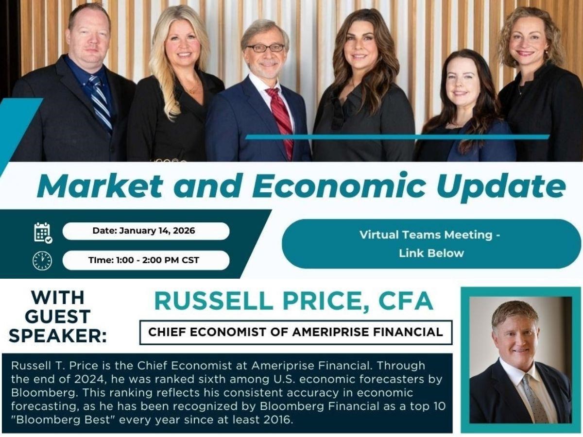 Market and Economic Update Date: Wednesday, January 14, 2026 Time: 1:00 PM - 2:00 PM CST Join this event online Presented By: Russell Price, Chief Economist - Ameriprise Financial Hosted By: Tiras Wealth Management During this complimentary virtual session, we’ll discuss: Factors that may influence market volatility in 2026 Strategies to help navigate market uncertainty A special presentation on Economic and Market Outlook from Ameriprise’s Chief Economist, Russell Price Date: Wednesday, January 14, 2026 Time: 1:00 - 2:00pm CST Russell T. Price is the Chief Economist at Ameriprise Financial. Through the end of 2024, he was ranked sixth among U.S. economic forecasters by Bloomberg. This ranking reflects his consistent accuracy in economic forecasting, as he has been recognized by Bloomberg Financial as a top 10 "Bloomberg Best" every year since at least 2016. For more information: email us at tiraswealthmanagement@ampf.com Share Email Text message Facebook LinkedIn X Add to Calendar Google Calendar Yahoo! Calendar This is an informational seminar. There is no cost or obligation. Certified Financial Planner Board of Standards Inc. owns the certification marks CFP®, CERTIFIED FINANCIAL PLANNER(R) and CFP certification mark (with plaque design) in the U.S. Investment products are not insured by the FDIC, NCUA or any federal agency, are not deposits or obligations of, or guaranteed by any financial institution, and involve investment risks including possible loss of principal and fluctuation in value.