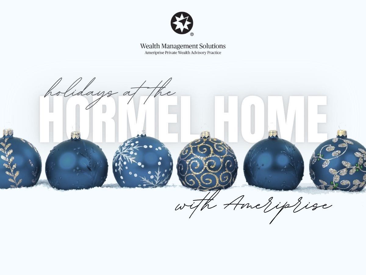 Holidays at the Hormel Home - Austin, MN Date: Tuesday, December 2, 2025 Time: 3:00 PM - 7:30 PM CST Location: The Hormel Historic Home, 208 4th Avenue NW, Austin, MN 55912 Hosted By: Brianne Erickson, Private Wealth Advisor | Jamie Surdy, Private Wealth Advisor | Toby Hovelsrud, Private Wealth Advisor | Heather Nelson, Financial Advisor Celebrate the season with us in the timeless elegance of the Hormel Historic Home. The evening will feature festive music, beautiful holiday lights and refreshments. Attire is flexible - please feel free to dress in festive or cocktail attire if you'd like.Please kindly RSVP by November 21st. RSVPs are required to attend. Only 1 RSVP per household is necessary. If bringing a guest, please add your guest(s) names into the comments section of the RSVP form. If you have any questions, please call our office.We're excited to hose this event again this year and we invite you to bring a guest or two who would enjoy it as much as you do. If there's someone in your life you think would value our approach to planning, we'd love to meet them. To reserve a spot: call us at 507.437.3523 or email us at wealth-management-solutions@ampf.com RSVP Online Event registration Date: Time: Enter your information below to RSVP for this event. We will contact you via phone or email to confirm your registration. First Name Last Name Email Phone (optional) Comments/Questions/Special Needs for the event (optional) Ameriprise Financial understands that privacy and security are important to you. We will only use the information to send offers we believe are relevant to you and, if you become a client, to send you information about your accounts. Visit the Email Preferences page to change your email choices. Submit Your RSVP was not sent. Return to form Thank you for your interest in this Ameriprise Financial event. We will contact you shortly to confirm your registration. Please note: Your registration is not complete until you have received final confirmation. Share Email Text message Facebook LinkedIn X Add to Calendar Google Calendar Yahoo! Calendar Share Email Text message Facebook LinkedIn X Add to Calendar Google Calendar Yahoo! Calendar There is no cost or obligation. The Compass is a trademark of Ameriprise Financial, Inc. Securities offered by Ameriprise Financial Services, LLC. Member FINRA and SIPC. © 2025 Ameriprise Financial, Inc. All rights reserved.