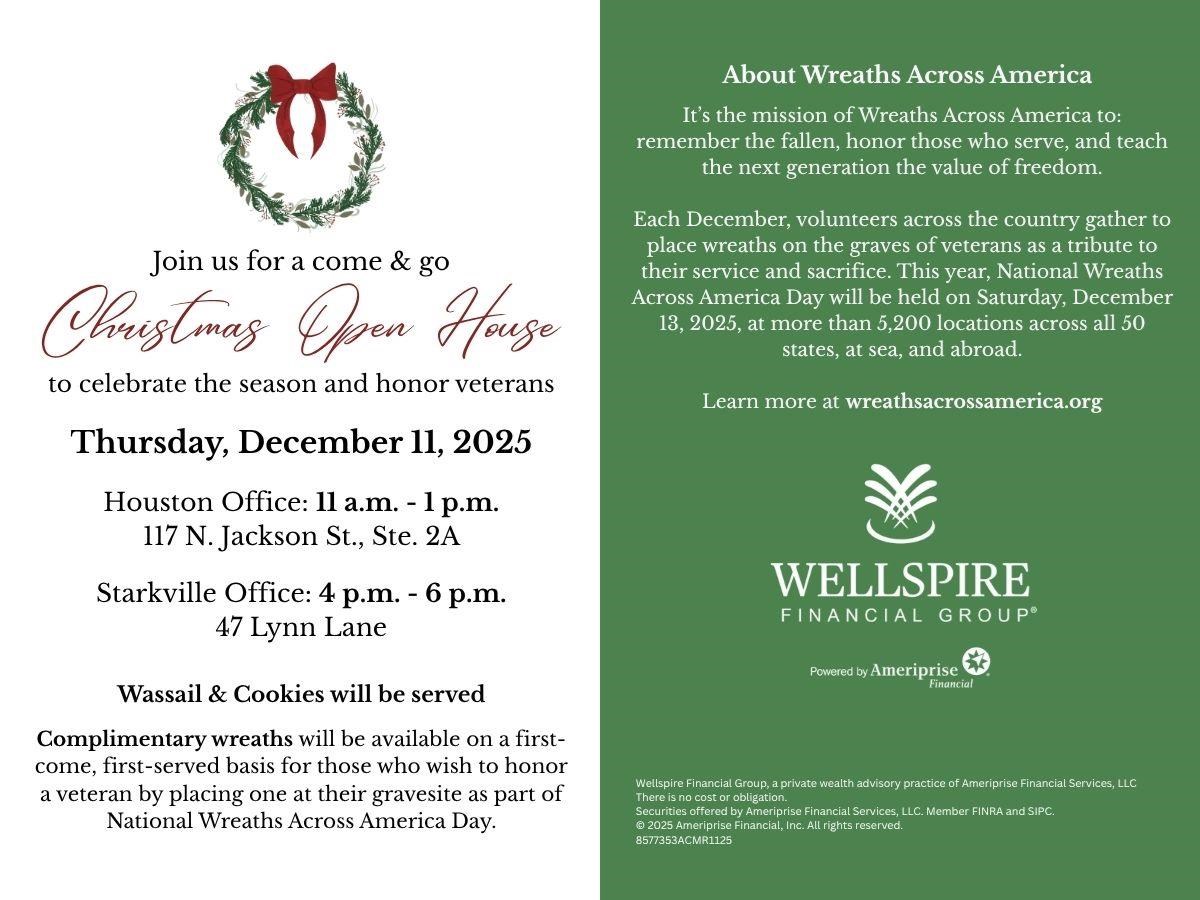 Christmas Open House Date: Thursday, December 11, 2025 Time: 11:00 AM - 6:00 PM CST Location: Wellspire Financial Group, 47 Lynn Lane, Starkville, MS 39759 Hosted By: Wellspire Financial Group Join us for a come and go Christmas Open House in both office locations! Stop by our Houston office from 11 a.m. - 1 p.m. or our Starkville office from 4 - 6 p.m. Complementary wreaths will be provided for those who wish to place one at a veteran's grave for National Wreaths Across America Day! For more information: call us at 662.323.8318 or email us at Rileigh.Campbell@ampf.com Share Email Text message Facebook LinkedIn X Add to Calendar Google Calendar Yahoo! Calendar