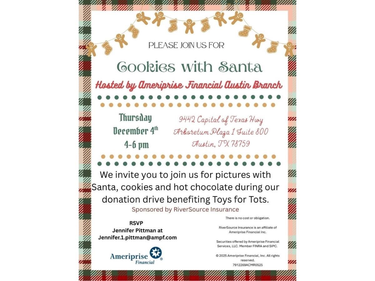 Cookies with Santa Date: Thursday, December 4, 2025 Time: 4:00 PM - 6:00 PM CST Location: 9442 Capital of Texas Hwy, Arboretum Plaza 1 Suite 800, Austin, TX 78759 Hosted By: Ameriprise Financial Austin Branch Sponsored By: RiverSource Insurance We invite you to join us for pictures with Santa, cookies and hot chocolate during our donation drive benefiting Toys for Tots To reserve a spot: call us at 512.691.5947 or email us at Jennifer.1.pittman@ampf.com RSVP Online Event registration Date: Time: Enter your information below to RSVP for this event. We will contact you via phone or email to confirm your registration. First Name Last Name Email Phone (optional) Comments/Questions/Special Needs for the event (optional) Ameriprise Financial understands that privacy and security are important to you. We will only use the information to send offers we believe are relevant to you and, if you become a client, to send you information about your accounts. Visit the Email Preferences page to change your email choices. Submit Your RSVP was not sent. Return to form Thank you for your interest in this Ameriprise Financial event. We will contact you shortly to confirm your registration. Please note: Your registration is not complete until you have received final confirmation. Share Email Text message Facebook LinkedIn X Add to Calendar Google Calendar Yahoo! Calendar Share Email Text message Facebook LinkedIn X Add to Calendar Google Calendar Yahoo! Calendar There is no cost or obligation.RiverSource Insurance is an affiliate of Ameriprise Financial Inc.Securities offered by Ameriprise Financial Services, LLC. Member FINRA and SIPC.© 2025 Ameriprise Financial Services, Inc. All rights reserved.