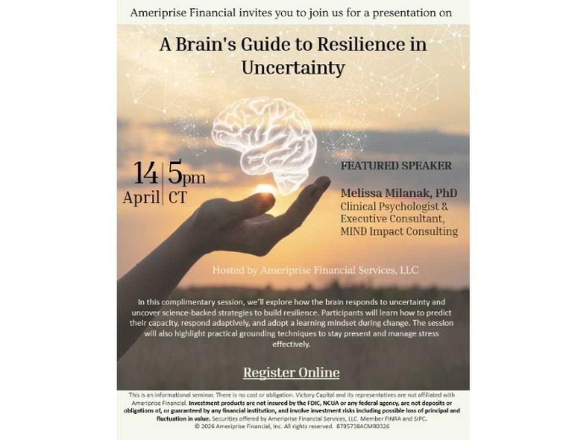 A Brain's Guide to Resilience in Uncertainty Date: Tuesday, April 14, 2026 Time: 5:00 PM - 6:00 PM CDT Join this event online Presented By: Melissa Milanak, PhD, Clinical Psychologist & Executive Consultant - MIND Impact Consulting Hosted By: Ameriprise Financial Services, LLC Sponsored By: Victory Capital Management In this complimentary session, we’ll explore how the brain responds to uncertainty and uncover science‑backed strategies to build resilience. Participants will learn how to predict their capacity, respond adaptively, and adopt a learning mindset during change. The session will also highlight practical grounding techniques to stay present and manage stress effectively. For more information: call us at 512.346.5400 or email us at Caitlyn.Parker@ampf.com Share Email Text message Facebook LinkedIn X Add to Calendar Google Calendar Yahoo! Calendar This is an informational seminar. There is no cost or obligation. Victory Capital and its representatives are not affiliated with Ameriprise Financial. Investment products are not insured by the FDIC, NCUA or any federal agency, are not deposits or obligations of, or guaranteed by any financial institution, and involve investment risks including possible loss of principal and fluctuation in value. Securities offered by Ameriprise Financial Services, LLC. Member FINRA and SIPC. © 2026 Ameriprise Financial, Inc. All rights reserved.